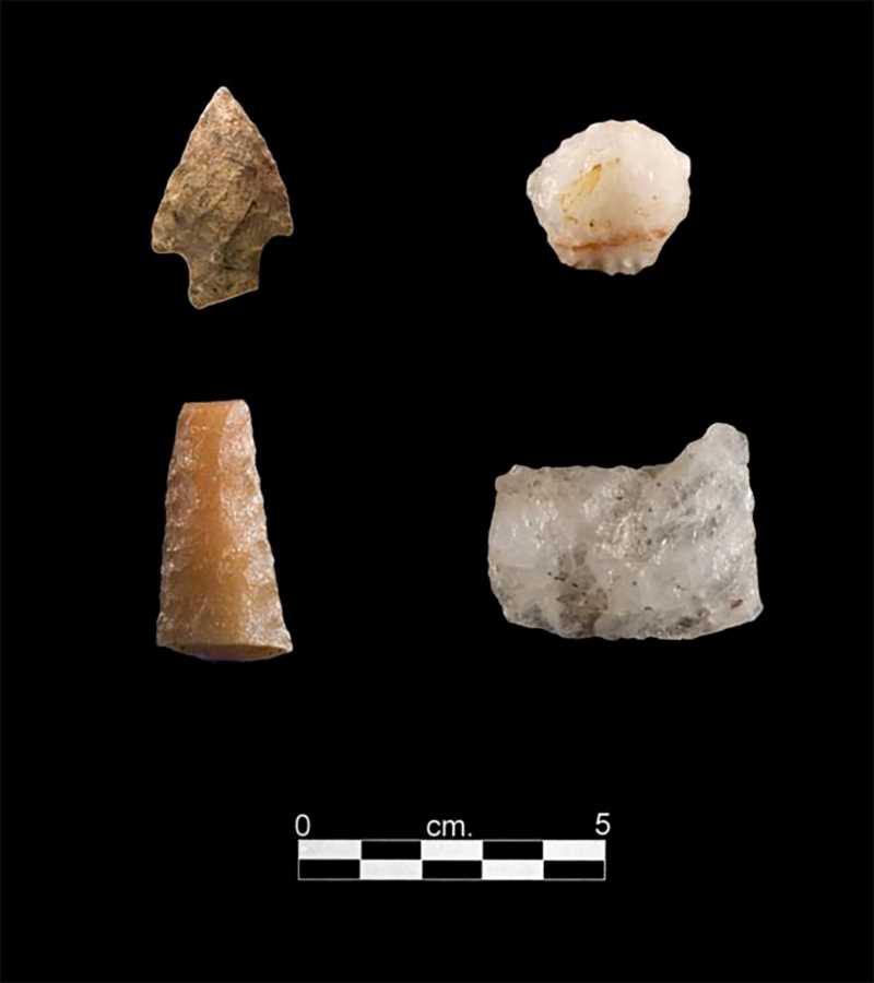 Lithic Scatter Phase I and II archaeological investigations in Rusk County, Wisconsin in 2007 identified a large lithic scatter. Diagnostic artifacts include an Agate Basin silicified sandstone blade turned into a drill, and a Steuben or Durst related point made of an unknown chert. The Agate Basin blade turned into drill (lower left) is broken at both ends. Although Agate Basin points are diagnostic of the Late Paleoindian time period, it is possible that this blade was found by later prehistoric people and turned into a drill. The Durst or Steuben related point (upper left) is related to the Late Archaic or Late Middle Woodland, respectively. A bifacially worked endscraper and a thumbnail scraper, both made from quartz (right), were also recovered.