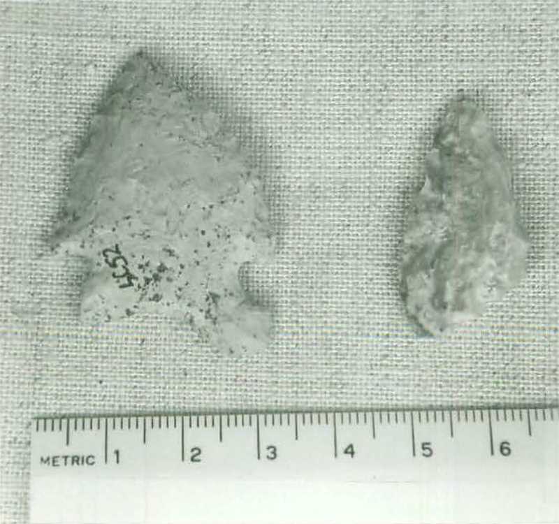 These points were found on the ground surface about 40 years ago on a high terrace setting overlooking the La Crosse River floodplain in La Crosse County, Wisconsin. One is a side-notched point with a concave base. The original report suggested that it could be a Woodland type; however, re-examination found that the blade edges are somewhat beveled from resharpening and the concave base is ground. These attributes are more characteristic of Early-Middle Archaic projectile points (ca 5,000-7,000 BP). The second point, also made of chert, is a crudely made triangular point that could be either Late Woodland (1200-900 BP) or Oneota (350-700 BP) in age.
