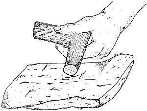 Shaping the piece into the desired tool form is the second step in the tool making process. Early stages of this process are done using a hammerstone. For the later and finer work a baton of wood or antler is used to thin the edges and to establish the form.