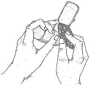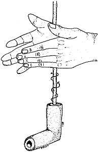 Step 5 - The hole in the pipe bowl was formed using a chipped stone drill hafted to a thin shaft. By holding the pipe between the feet or knees, and rotating the shaft of the hafted drill between the palms of the hands, a hole was slowly formed.