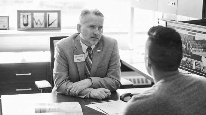 Scott Johns, UWL assistant director of admissions, meets with Ryan Crain. Although Ryan didn't meet the academic requirements for UWL, Johns noticed a certain energizing quality in him. He helped Ryan transfer to UWL.
