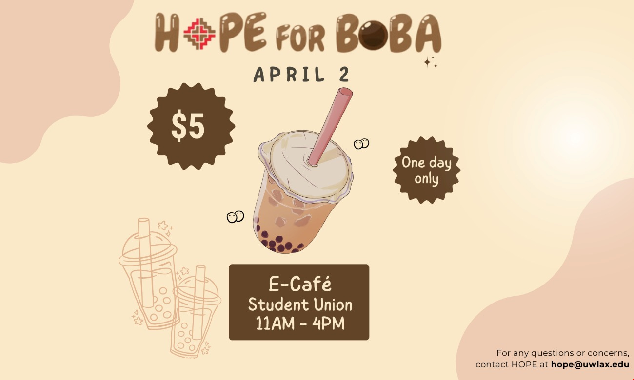 Come on over to the E-Cafe, located in the basement of the Student Union, for HOPE's Boba fundraiser on Thursday, April 2nd! We will have five delicious flavors: brown sugar milk tea, strawberry, mango, lychee, and taro. Each cup of boba costs $5 and can be paid in cash or through Venmo. This is a one-day event, so grab a cup before boba runs out!