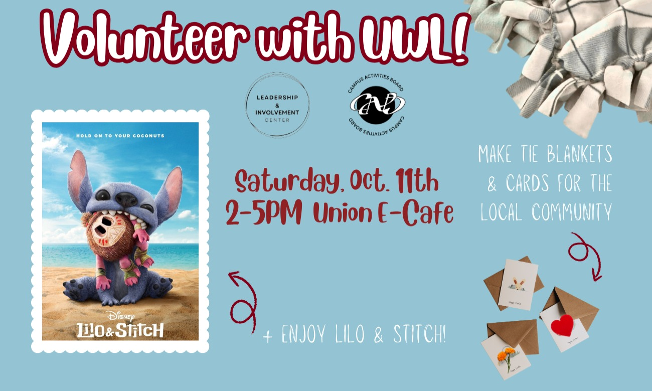 Bring your family for the opportunity volunteer on campus! Make tie blankets and cards for the local community, while enjoying a showing of Lilo & Stitch! We're excited to give back with you on Saturday, October 11th from 2-5PM in the Union E-Cafe!