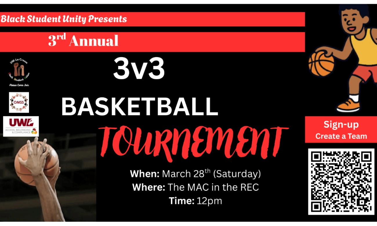 Black Student Unity is hosting a 3v3 Basketball Tournament on Saturday, March 28th, from 12:00 pm-3:45 pm. This tournament will be held in the MAC at the Recreational Eagle Center. Community members, UWL students, and faculty are welcome to join. Each team can have up to four players, including one sub and three players on the court at a time. Each player pays an entry fee of $5, and spectators pay $1. The tournament will be organized in a bracket-style format. There will be four games going on at once. Those not playing will keep score for the other team. Each game will be about 20 minutes with 10-minute breaks following. Please coordinate to wear the same color as your team. The top two teams in the tournament will win free t-shirts!