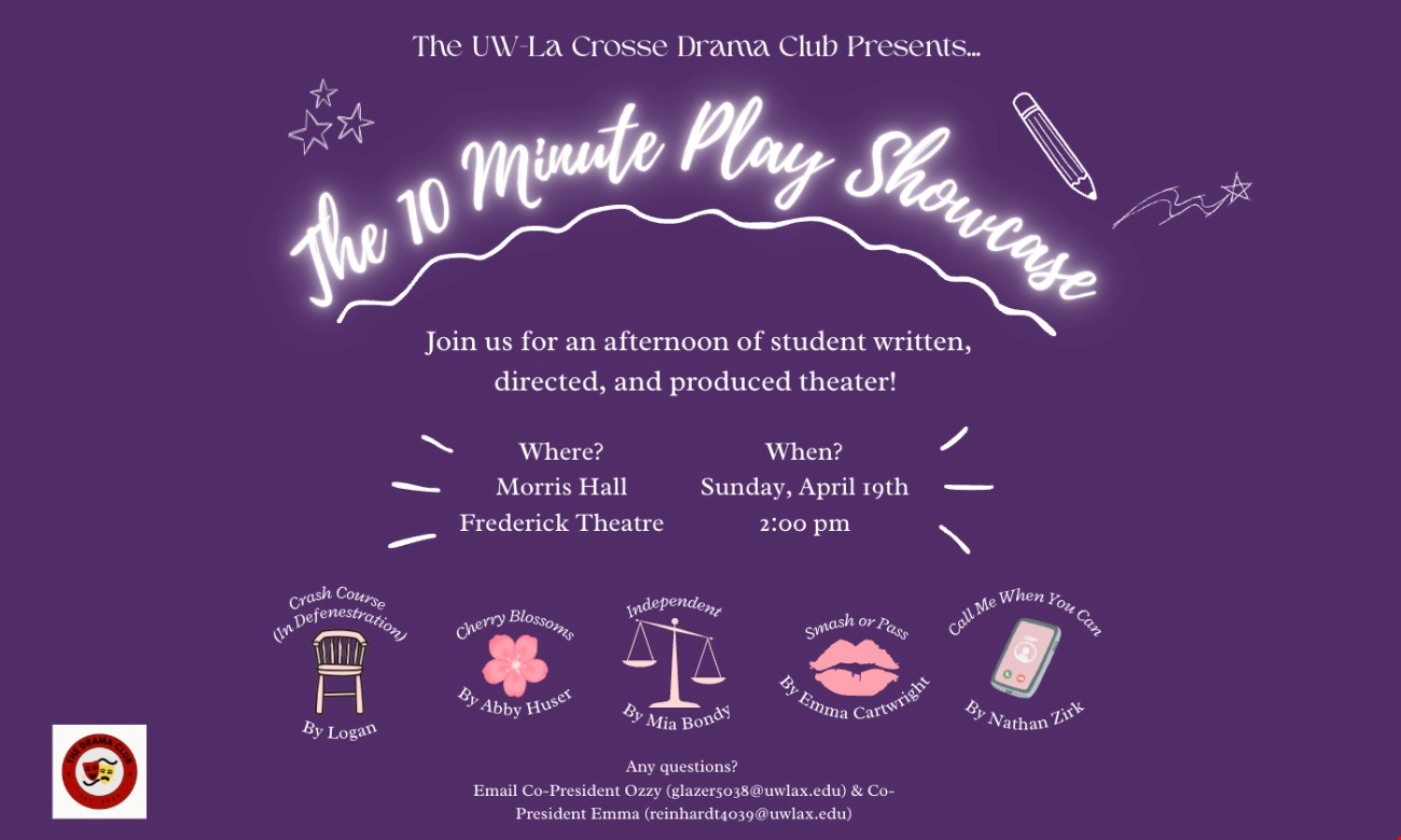 Join us for an afternoon of student written, directed, and produced theater! We will be showcasing 5 pieces, each fully developed by UWL students. Come support student-led theatre!
