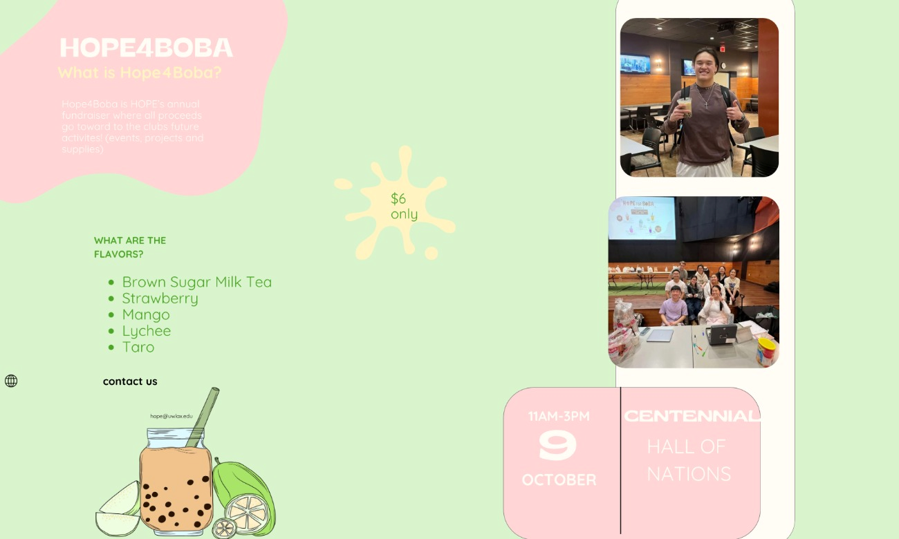 Take a stop by the Hall of Nations, located on the first floor of Centennial Hall, for HOPE's Boba fundraiser! We will have five delicious flavors: brown sugar milk tea, strawberry, mango, lychee, and taro. Each cup of boba costs $6 and can be paid in cash or through Venmo. This is a one-day event, so grab a cup before boba runs out!