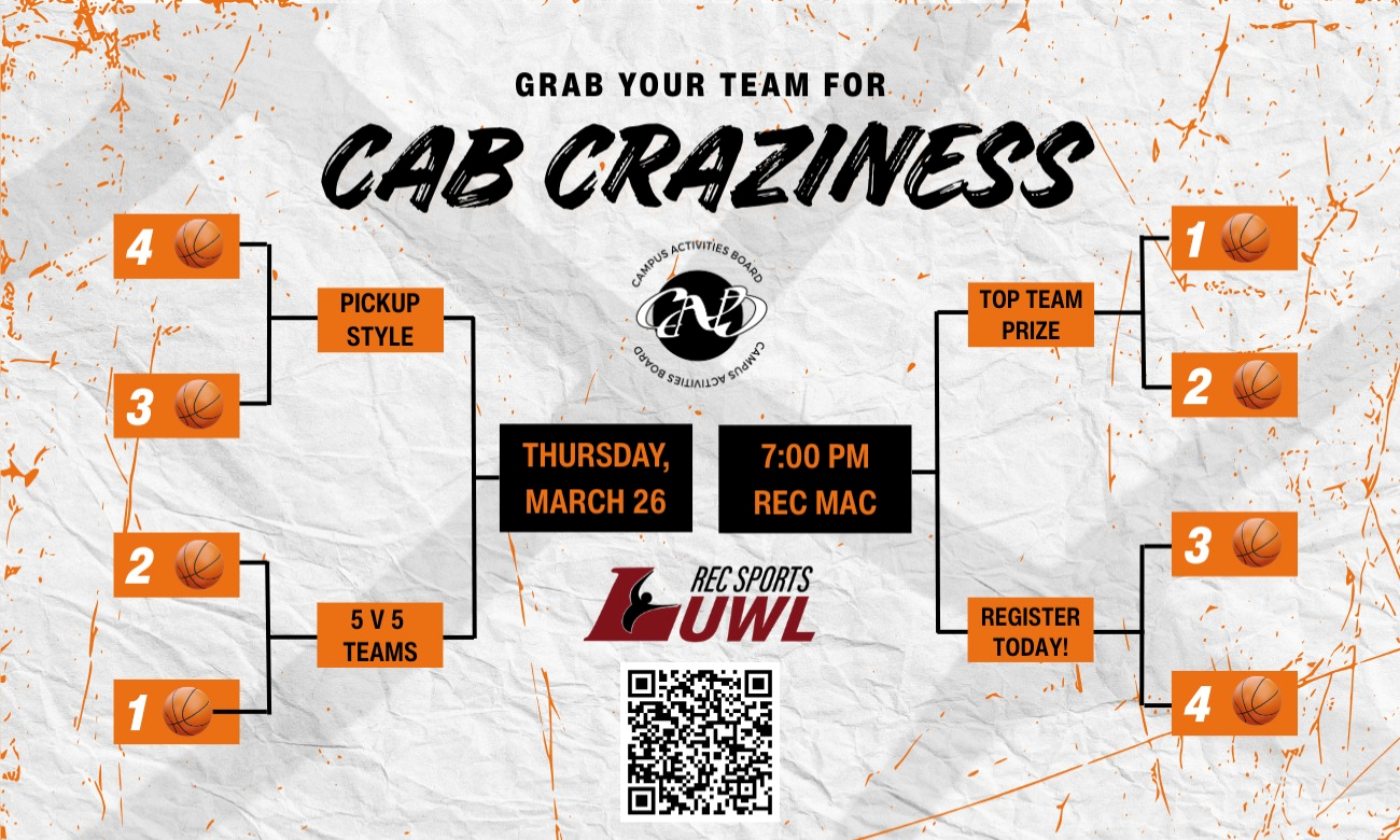 Register your team for the CAB Craziness basketball tournament! Gameplay will begin at 7:00 pm on March 26th in the MAC (upper level of the REC). Teams will consist of 5 members for a series of 5v5, quick-paced, pick-up style basketball games! The top team will win a prize! Register your team by Monday, March 23rd!