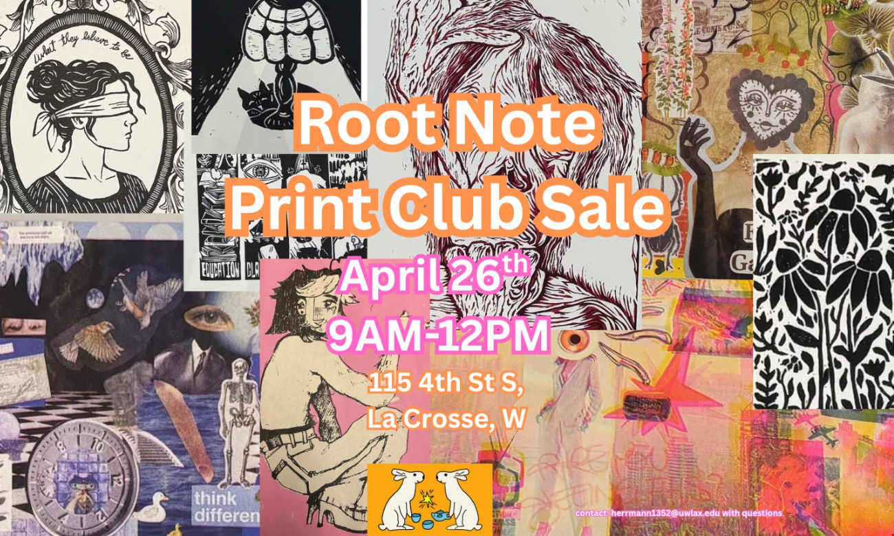 The Print Club is hosting a sale at the Root Note coffee shop in downtown La Crosse. This will be on April 26th from 9AM-12PM. Come buy some handmade prints and get an amazing coffee!