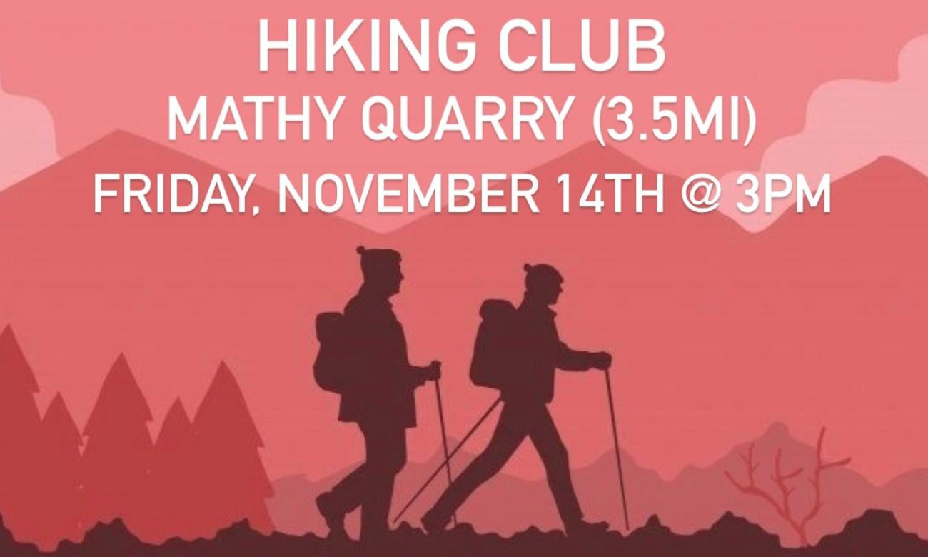 Join us on Friday, November 14th at the Mathy Quarry MTB parking lot at 3:00pm for a 3.4 mile hike!