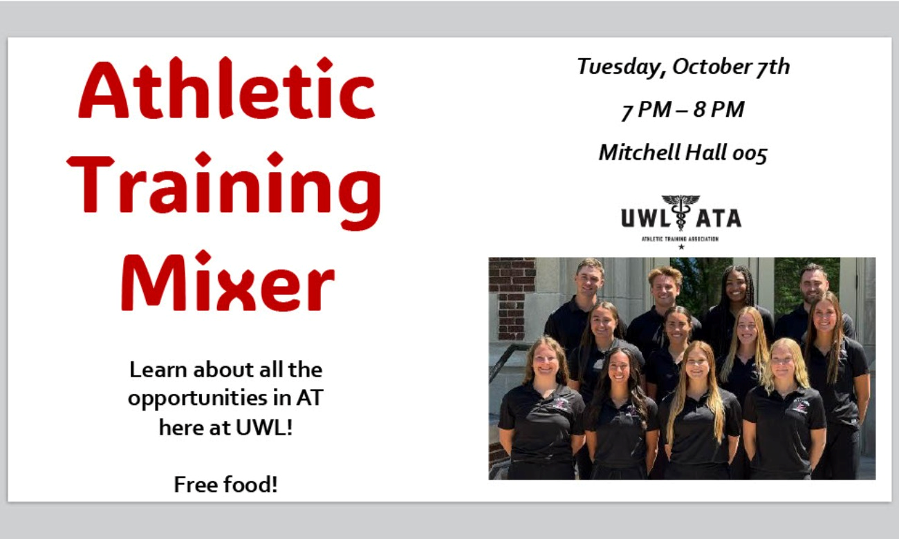 This will be an Athletic Training Mixer where you will not only hear about UWLATA but the Athletic Training Graduate Program, Dual Degree Program, and the Eagle Aide Program. This is an amazing opportunity to meet current athletic training students, faculty, and peers interested in athletic training and enjoy some pizza and desserts!