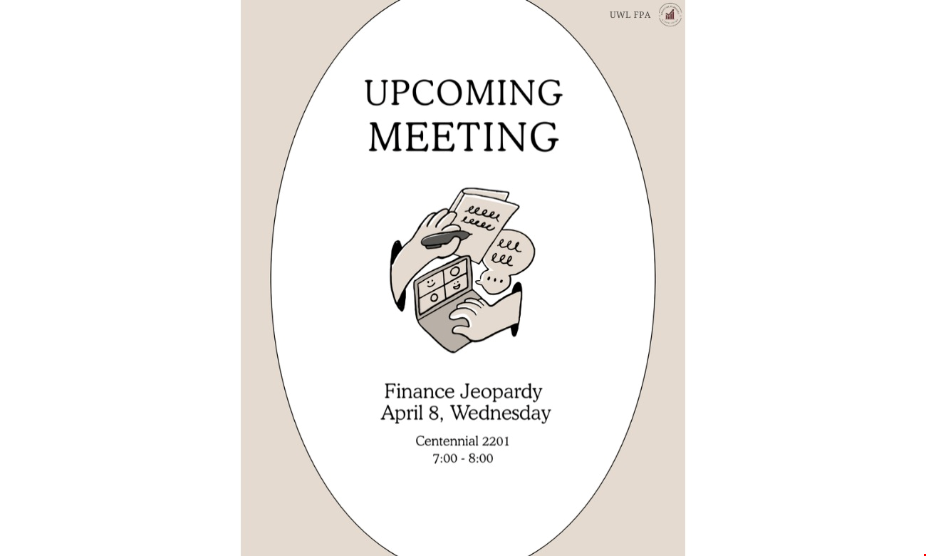 We will be playing Finance Jeopardy, hosted by our Treasurer and Secretary, Nolan Henry and Eric Peck. This will be a super fun, interactive meeting with trivia questions on all things investing, financial literacy, and UWL. As always, this meeting will be held at 7:00 pm in Centennial 2201, and we would love to have you there!