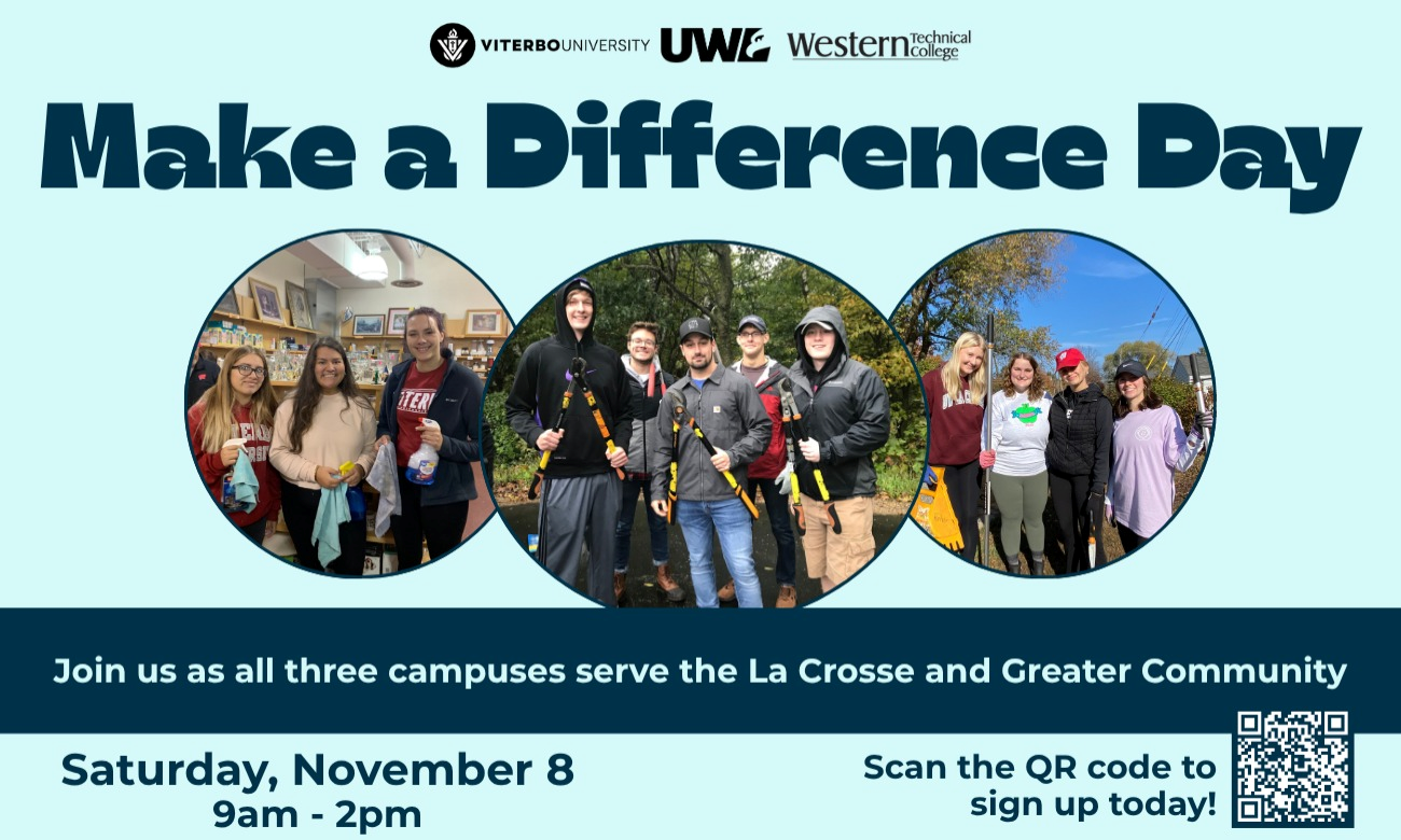 Join students from UWL, Viterbo University, and Western Technical College for a powerful day of service during Make A Difference Day! This annual tri-campus event brings together volunteers from across the La Crosse community to support local organizations through hands-on projects that make a real impact.