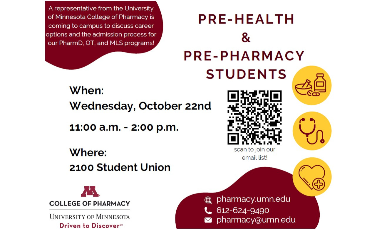 Representatives from the University of Minnesota will be coming to campus to discuss career options and the admissions process for their PharmD as well as their new OT and Medical Laboratory Sciences programs.