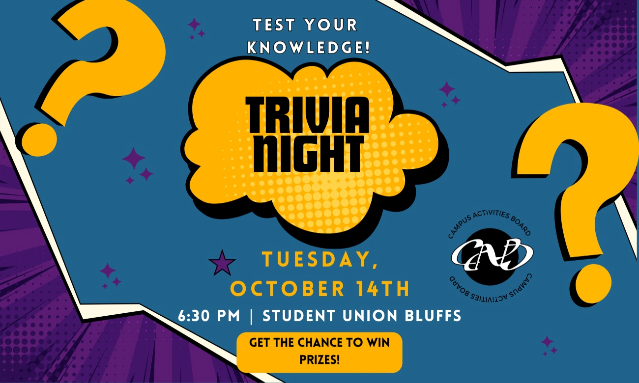 It’s TRIVIA time! Head to the Student Union Bluffs on Tuesday, October 14th, for trivia night! Bring your friends and test your knowledge on a variety of categories! Winning teams will get prizes! We’ll see you at 6:30PM in the Union Bluffs! ❔❔❔