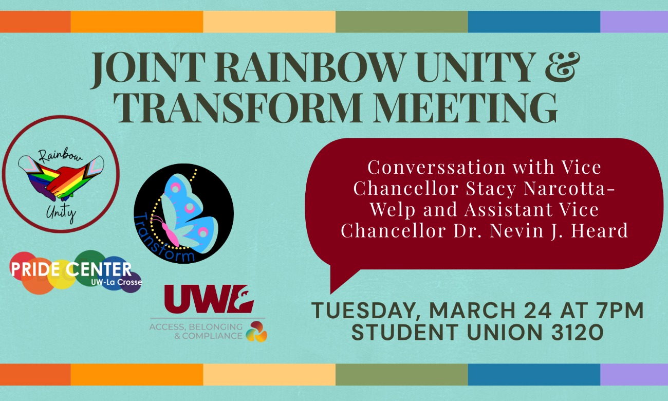 Members of Rainbow Unity and Transform are invited to join Vice Chancellor Stacy Narcotta-Welp and Assistant Vice Chancellor Dr. Nevin J. Heard. They will share data from the Campus Climate Survey and answer questions people have.