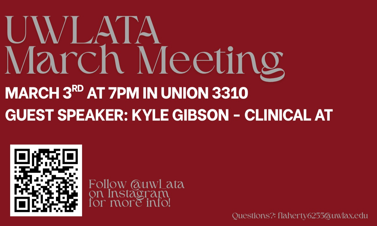 Join us March 3rd in Union 3310 at 7pm and hear from Kyle Gibson who has worked in professional and collegiate sports, industrial, and most recently in clinical settings!  Kyle will share his experiance and perspective on these settings and answer questions you might have about his experiance as an athletic trainer.