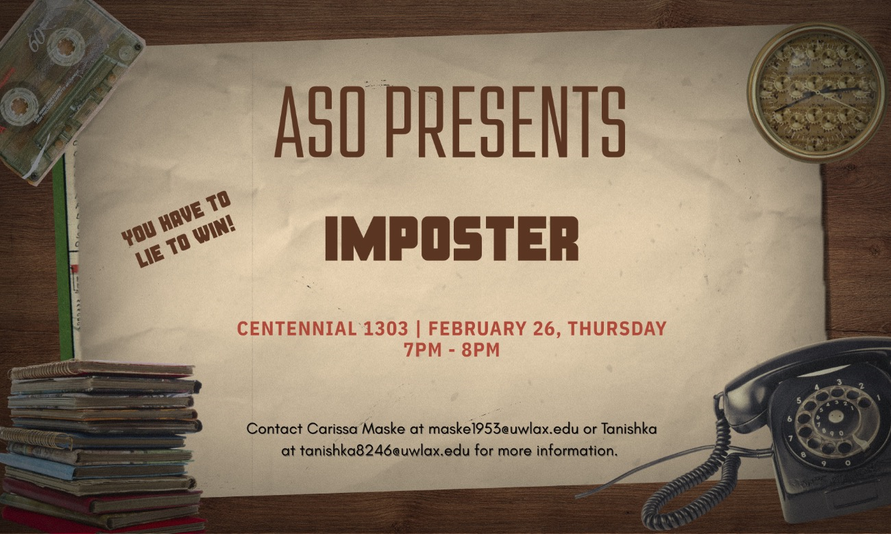 For questions about this event or to request disability accommodations , contact University Centers - MyOrgs at 608.785.8888 or univcenters@uwlax.edu.