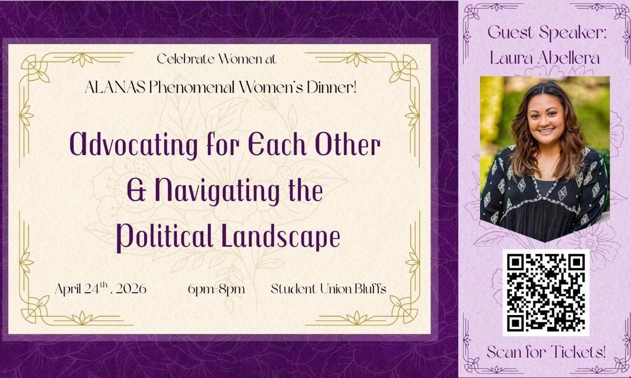 Join ALANA in a celebration of community on April 24 from 6-8pm! There will be a meal highlighting the cultures ALANA represents, awarding of community members for their work, and local vendors to purchase goods from! Dress code is semi-formal to formal.