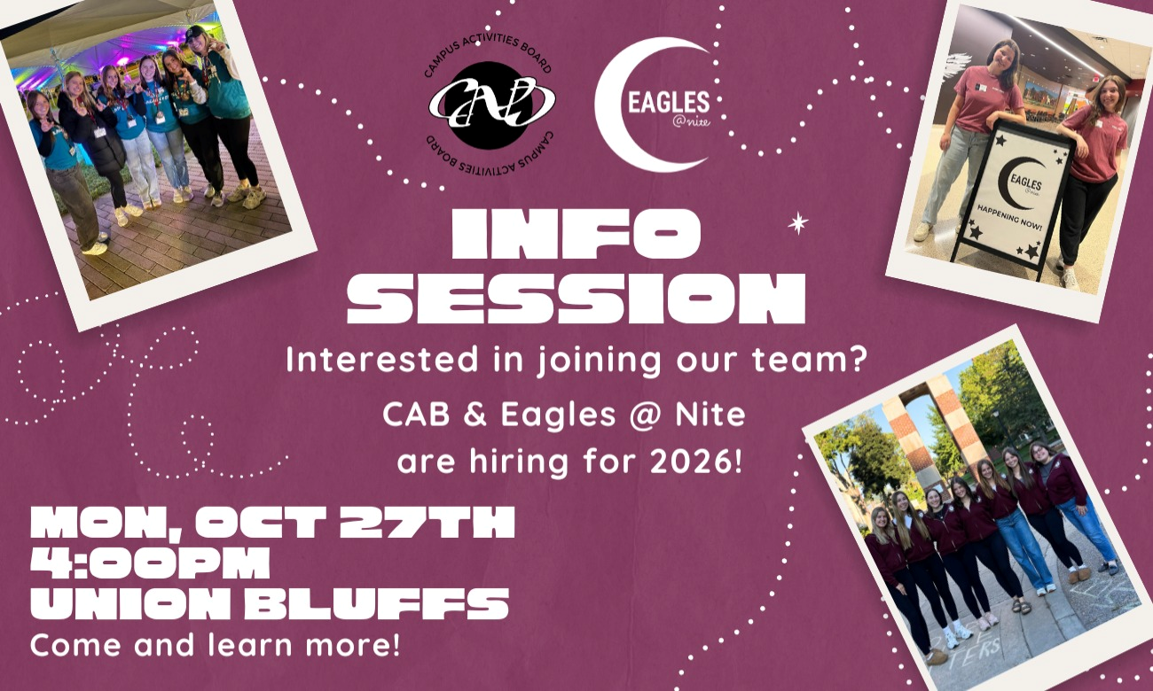 Our CAB and Eagles @ Nite teams are hiring for 2026! Interested in learning more about what we do? The info session is a great way to learn about working with CAB or Eagles @ Nite! Join us in the Bluffs on Monday, October 27th at 4:00pm!