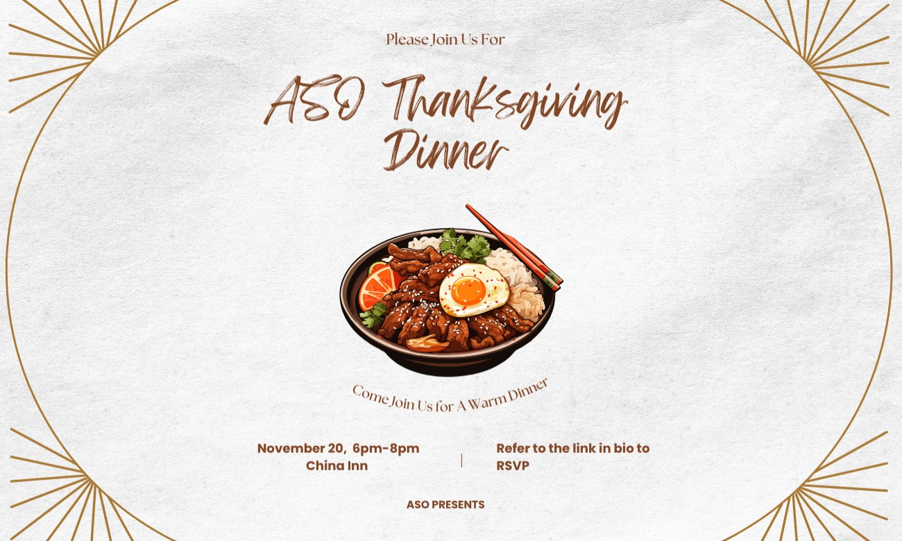 Join us for a warm thanksgiving dinner at China Inn! For more information and RSVP, check out our Instagram bio @uwl_aso.