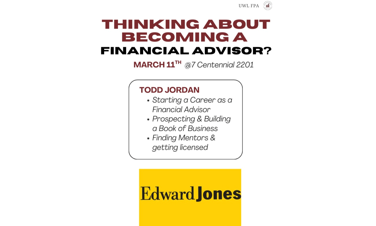 We are looking forward to our next FPA meeting, this Wednesday, March 11th at 7:00 pm in Centennial 2201, where we will be hosting Edward Jones financial advisor, Todd Jordan. He will be sharing his experience getting started as a financial advisor, from prospecting and building his book of business to finding mentors and getting licensed. If your thinking about having your own book of clients in the future, this is the perfect opportunity to learn what life is like in the first few years getting started!