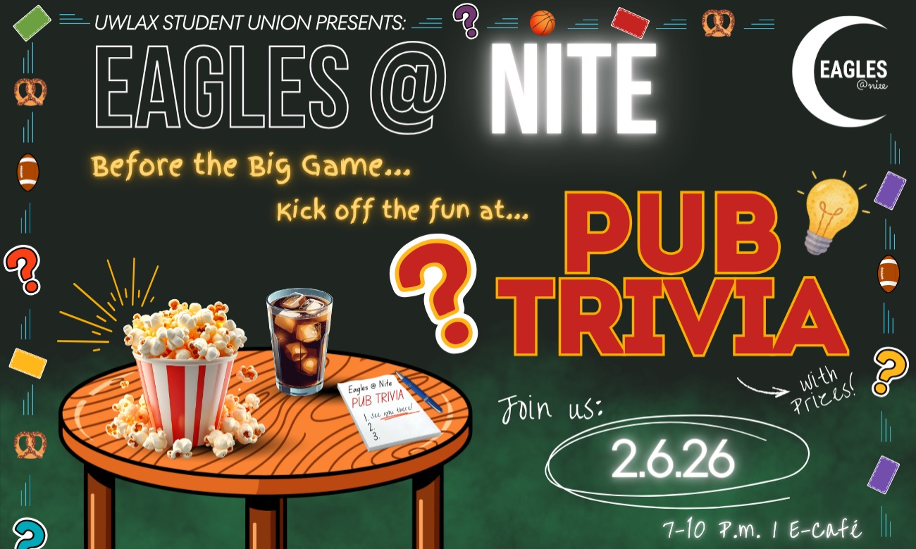 Come put your knowledge of sports and pop culture to the test and experience 6 rounds of trivia with a twist!! Come in teams of four or come solo, and we'll set you up with a team. Enjoy a night of food, friends, competitive fun, and a chance to win a prize before the BIG GAME! Bring your energy and join Eagles @ Nite in the E-Cafe for a night of Pub Trivia.