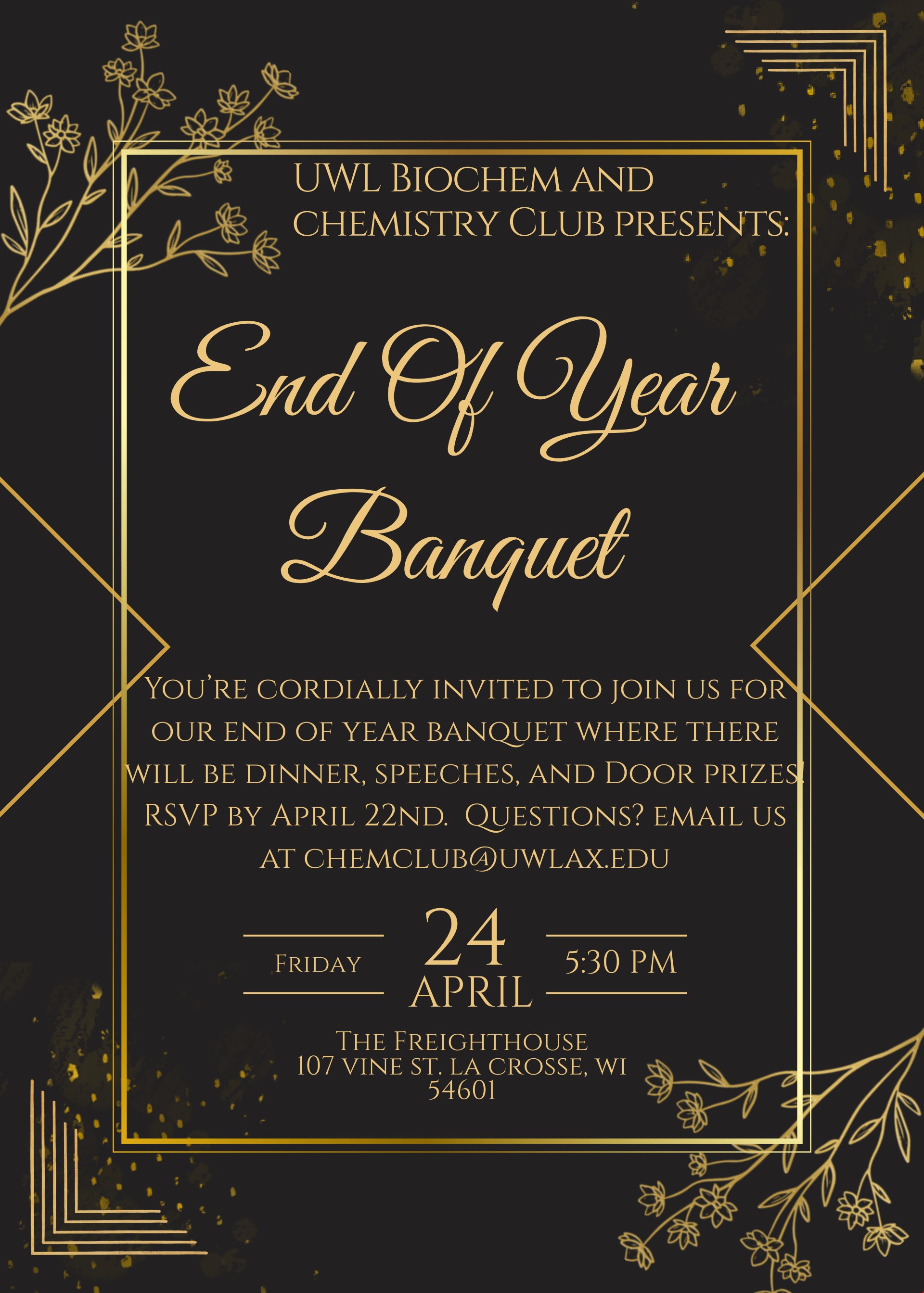 Join us for our last meeting of the year, our Chemistry Club Banquet! We will be meeting at the Freighthouse at 5:30 pm on April 24, 2026. We will be having prizes and awards to give out and some professors from the Chemistry Department will be joining us as well! The cost to attend is $20 but this is only for a limited amount of people so sign up now!