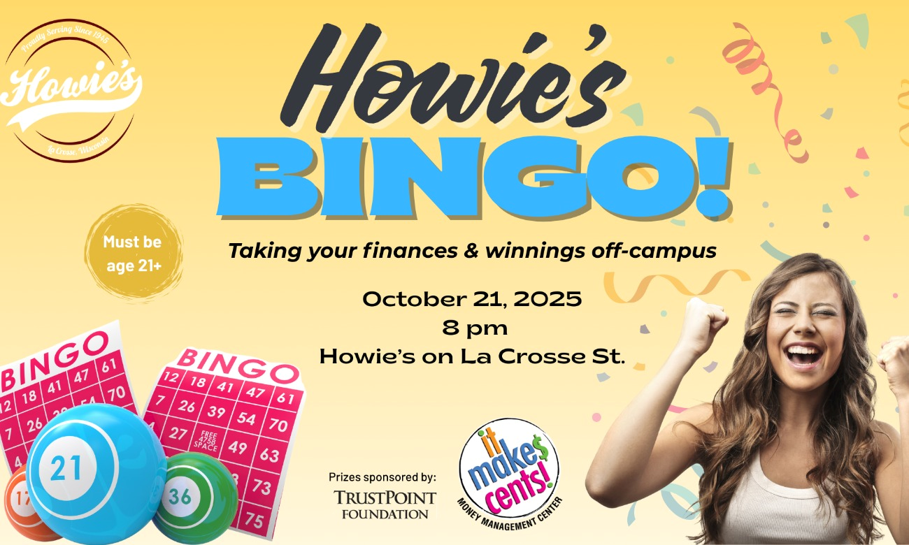 It Make$ Cents! to take your finances and winnings off-campus! Not only are we partnering with La Crosse's very own Howie's (right next to UWL) for a great night of bingo, but we have spectacular prizes to be won! Come learn about our IMC program and get the chance to win give-aways and prizes!