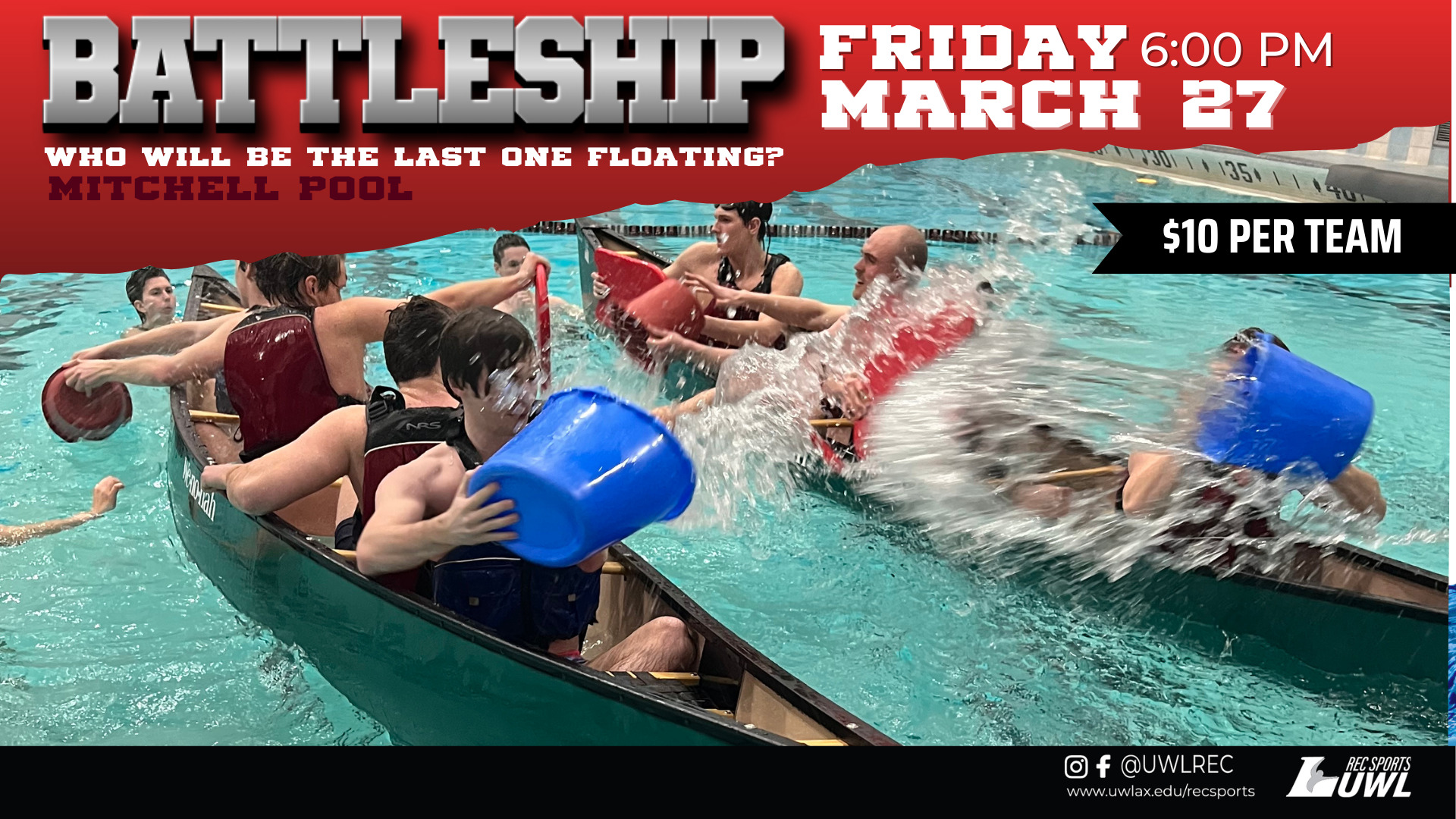 • The Tournament: With up to 4 canoes in the pool at once, teams will battle through elimination heats. Each team is guaranteed two games.  Only the strongest advance to the finals!