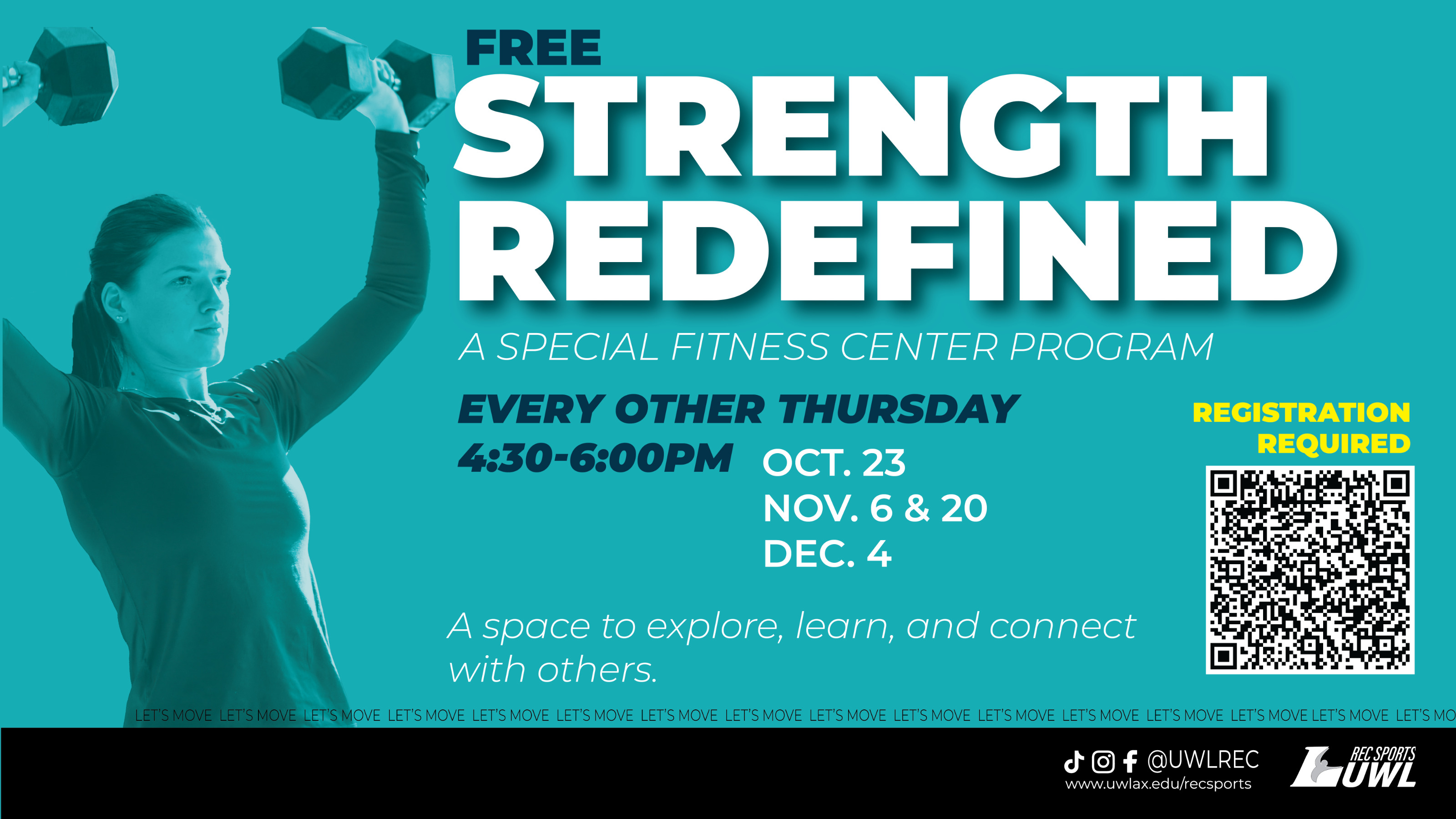 You’re not alone! Survey responses indicate that the Fitness Center is an uncomfortable and intimidating space for some individuals. Strength Redefined is a night for those that don’t typically use the Fitness Center, or use it less often, because they are new to weightlifting/fitness, feel uncomfortable or intimidated in our normal environment. Educational opportunities will be available each night. Allies, who want to redefine the Fitness Center into a more comfortable space for all are welcome to attend. Come find your community where we celebrate the efforts and goals accomplished no matter your experience level. Online registration is required 30 minutes in advance of the session start. This event will be held every other Tuesday night during the semester from 4-6:30pm.