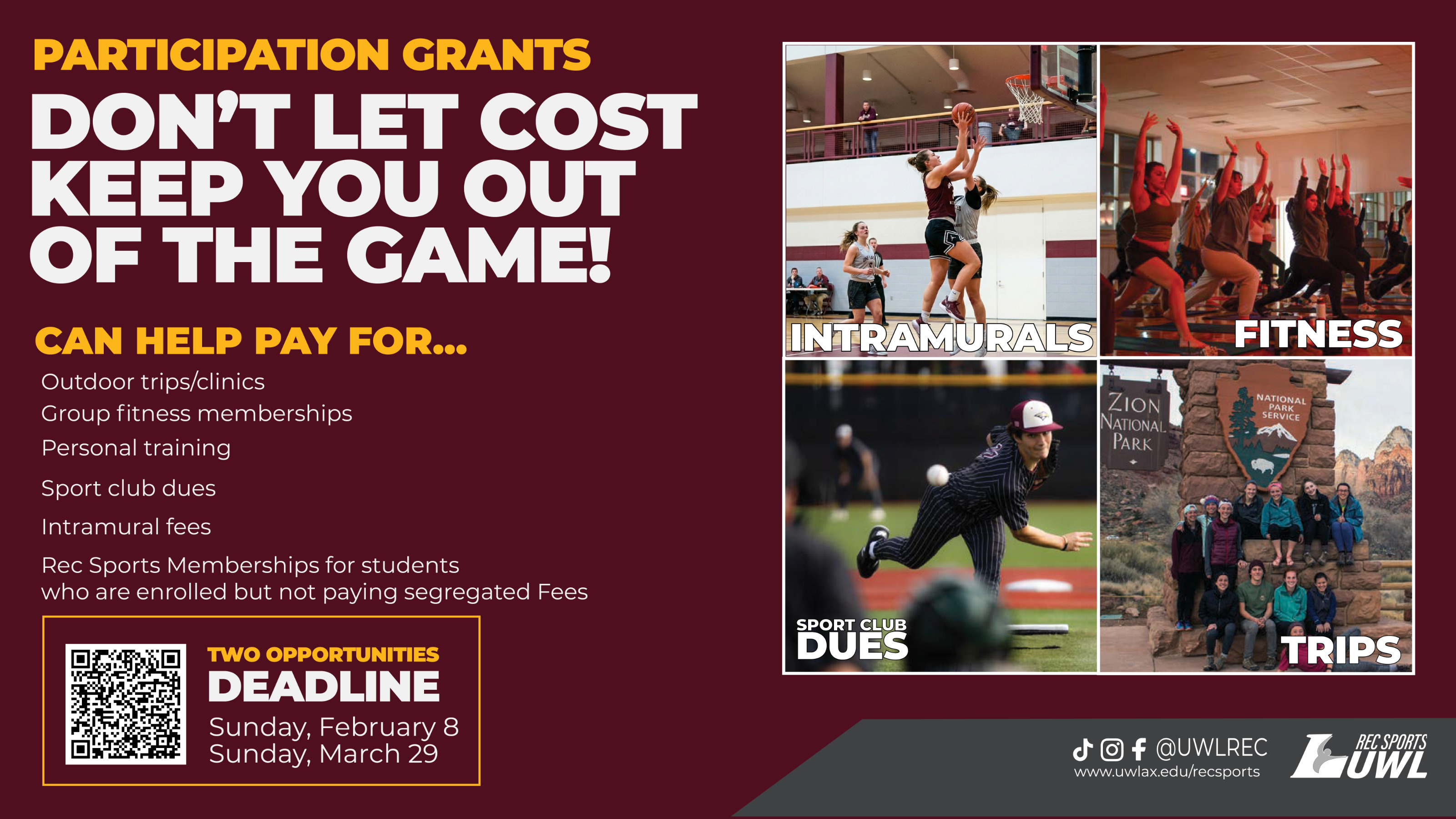 UWL Rec Sports believes that everyone should have access to campus recreation opportunities. This participation grant is a means to help provide unforgettable experiences and create lifelong memories for students who may not be able to participate due to financial barriers. Some Rec Sports programs and services have additional fees. These costs sometimes prohibit participation. The mission of this grant is to provide financial assistance to students who might otherwise be unable to participate. Students who are experiencing financial difficulties or barriers to participation are encouraged to apply.