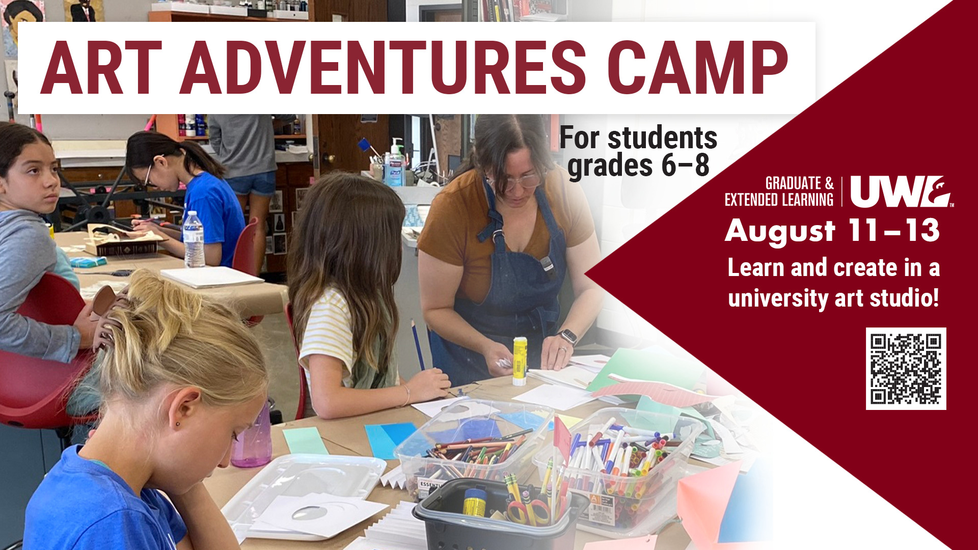 Join UWL Art Department faculty, Lisa Lenarz, to expand your creativity and art authorship in a campus art studio! Each day provides a new learning opportunity to gain hands-on experience, explore diverse mediums, and develop new artistic techniques. Student participants will leave each session with their own artwork to keep or share with others. Scholarships are available to cover 85% of the registration fee. Register early there is limited space. uwlax.edu/gel/ypc/art-adventures-camp/