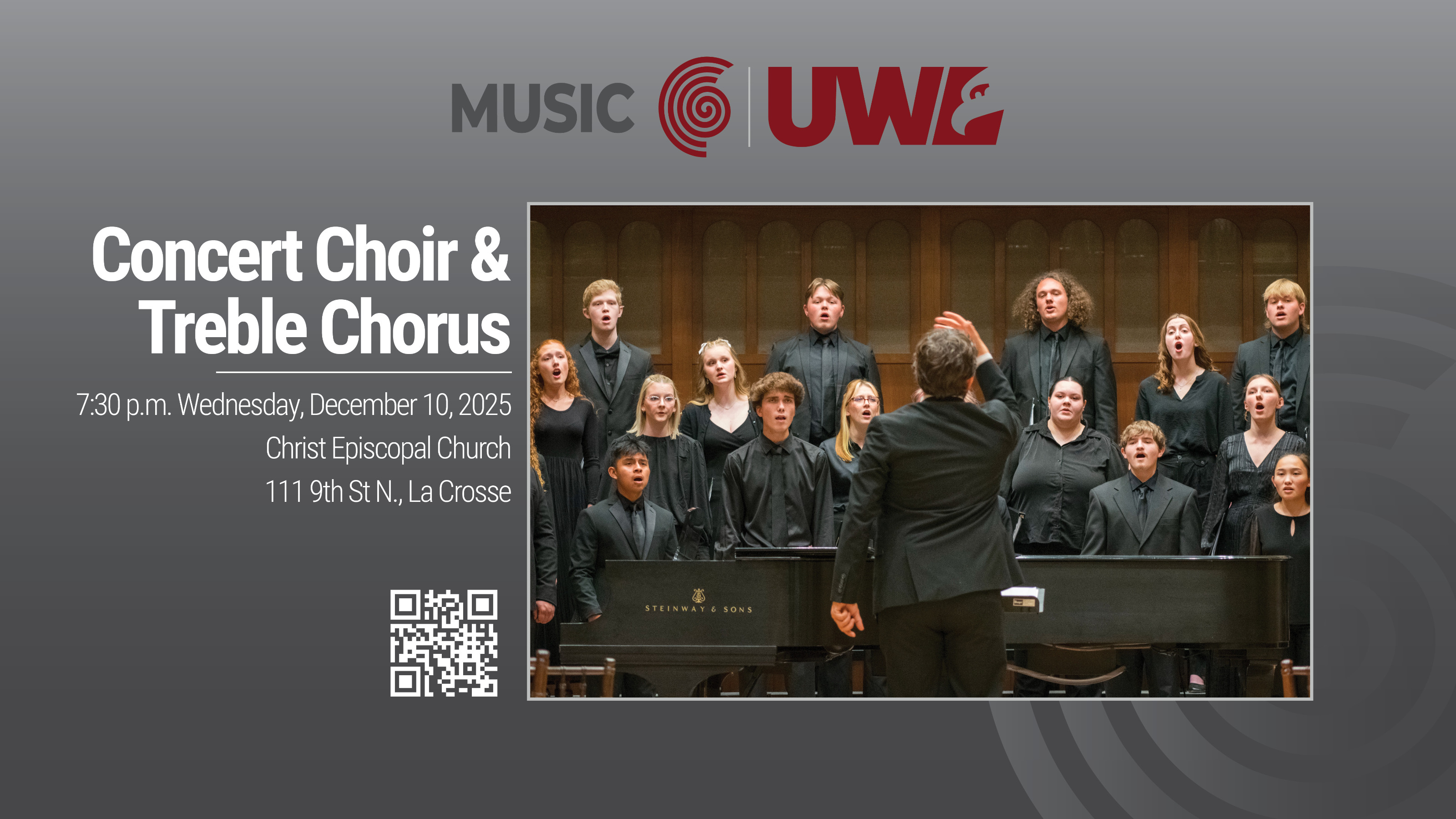 Join us for UWL's Treble Chorus under the direction of Dr. Kourtney Austin and the UWL Concert Choir under the direction of Dr. Christopher Hathaway for their holiday concert. Details forthcoming.