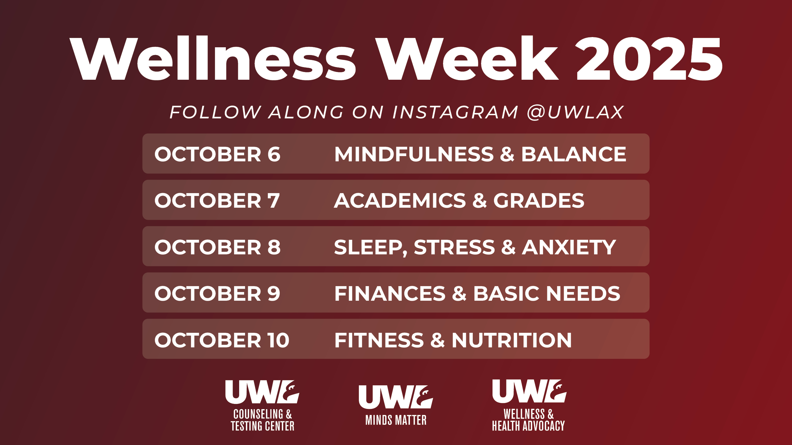 Explore the seven dimensions of wellness, attend events across campus, and learn about resources for well-being. Don't miss important Wellness Week updates on Instagram, follow @uwlax, @uwlpeerhealth, and @uwlctc!