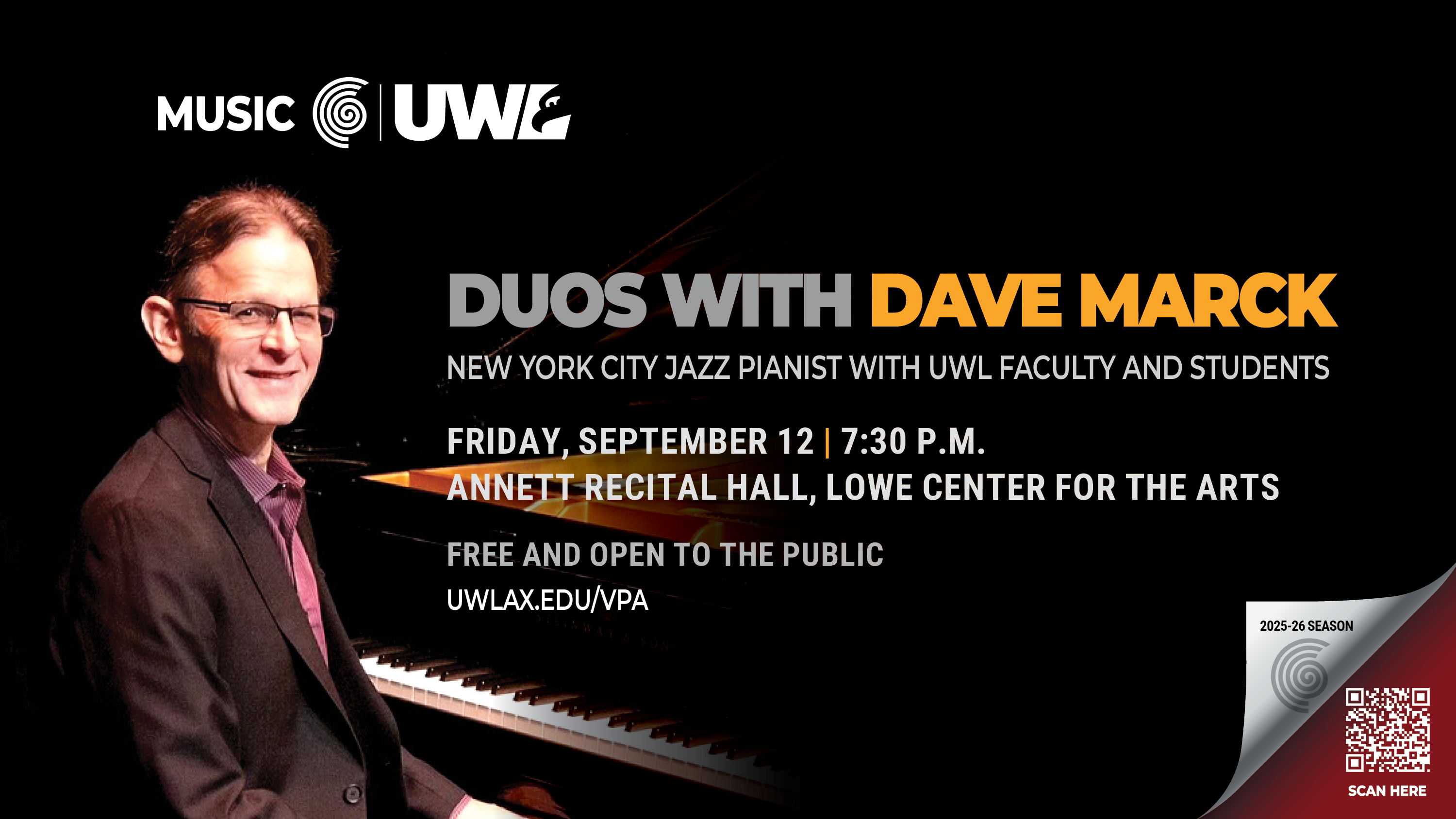 The University of Wisconsin–La Crosse Department of Music is proud to present “Duos with Dave Marck” on Friday, September 12, 2025, at 7:30 p.m. in Annett Recital Hall, located in the Truman T. Lowe Center for the Arts. This free concert is open to the public and promises an evening of intimate, spontaneous jazz improvisation featuring world-class musicianship.