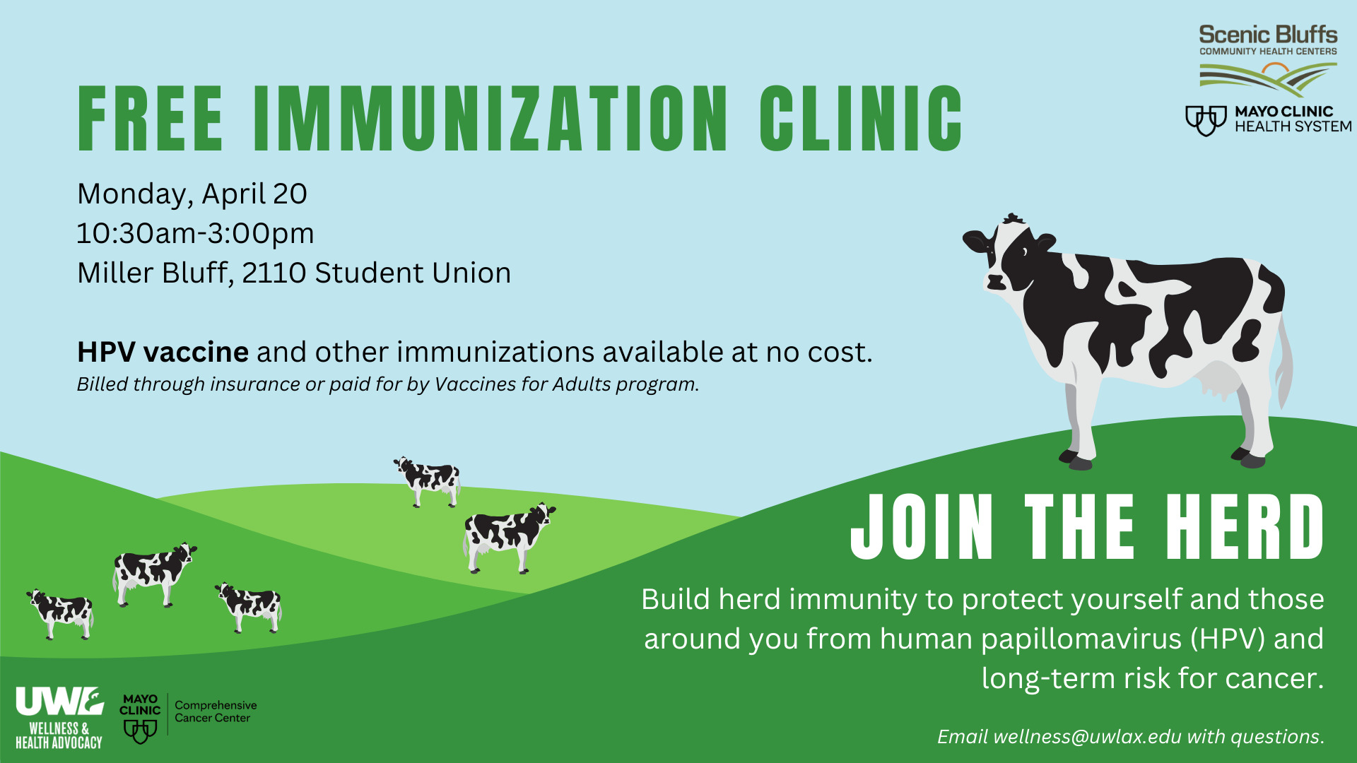 Join the herd! Safe and effective vaccination for human papillomavirus helps build herd immunity to prevent genital warts and several cancers. Wellness & Health Advocacy is partnering with Scenic Bluffs Community Health Centers, Mayo Clinic Health System, and the Wisconsin Cancer Collaborative to provide HPV immunizations at no cost for UWL students. Scenic Bluffs Community Health Centers will either bill insurance for the vaccine cost or provide it at no cost through the Vaccines for Adults program.