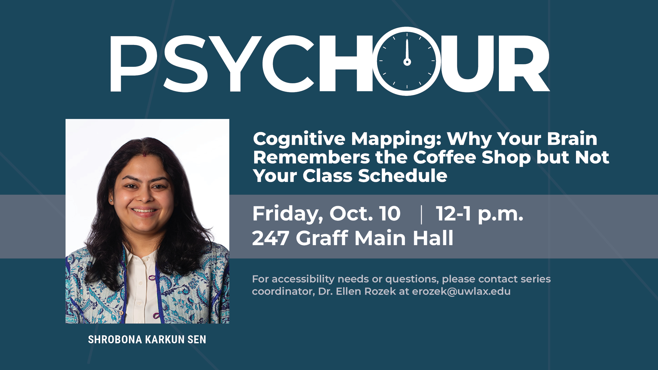 The Psychology Department invites you to our Psych Hour Series. This week's presentation is "Cognitive Mapping: Why Your Brain Remembers the Coffee Shop but Not Your Class Schedule" by Shrobona Karkun Sen from the Geography and Environmental Science Department. She will be discussing her interesting research that looks at the brain from a geography lens. Should be so interesting!
