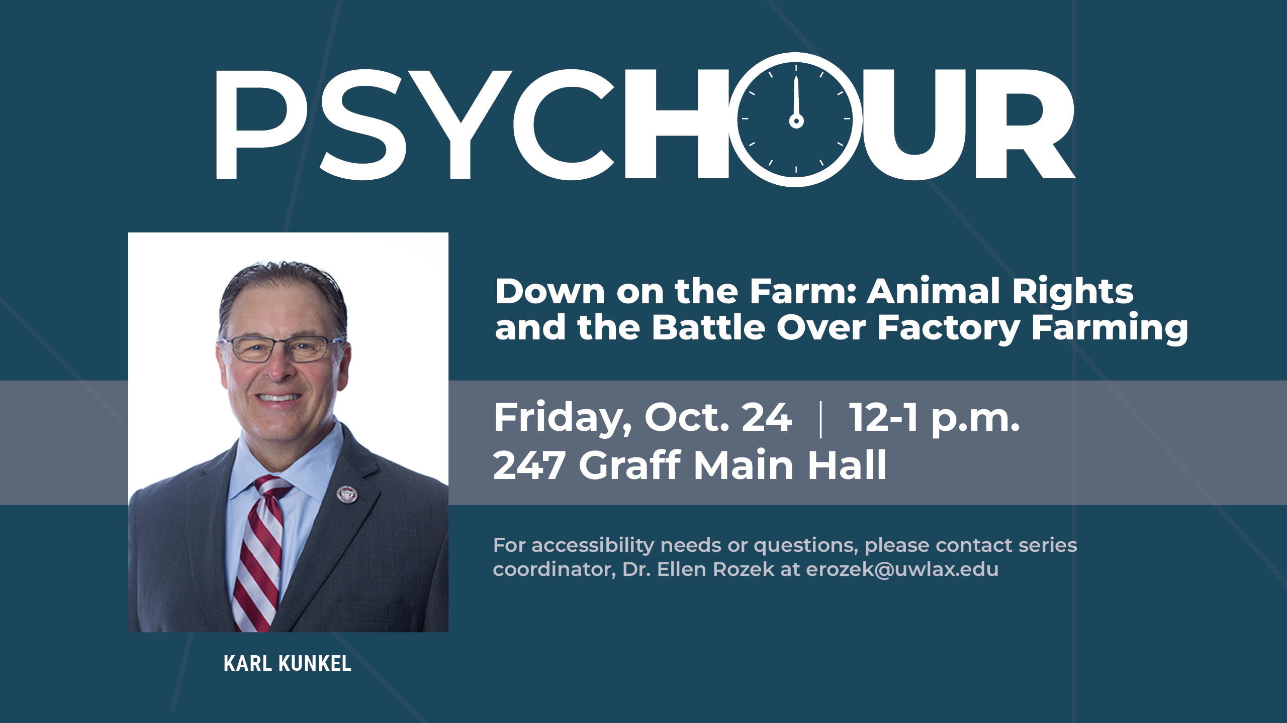 The Psychology Department invites you to our Psych Hour Series. This week's presentation is "Down on the Farm: Animal Rights and the Battle Over Factory Farming." Our very own CASSH Dean, Dean Karl Kunkel will be presenting on some of his scholarship interests. This is a great opportunity to remember that many of our administrators come from academic backgrounds with a really exceptional range of interests and learn something new!