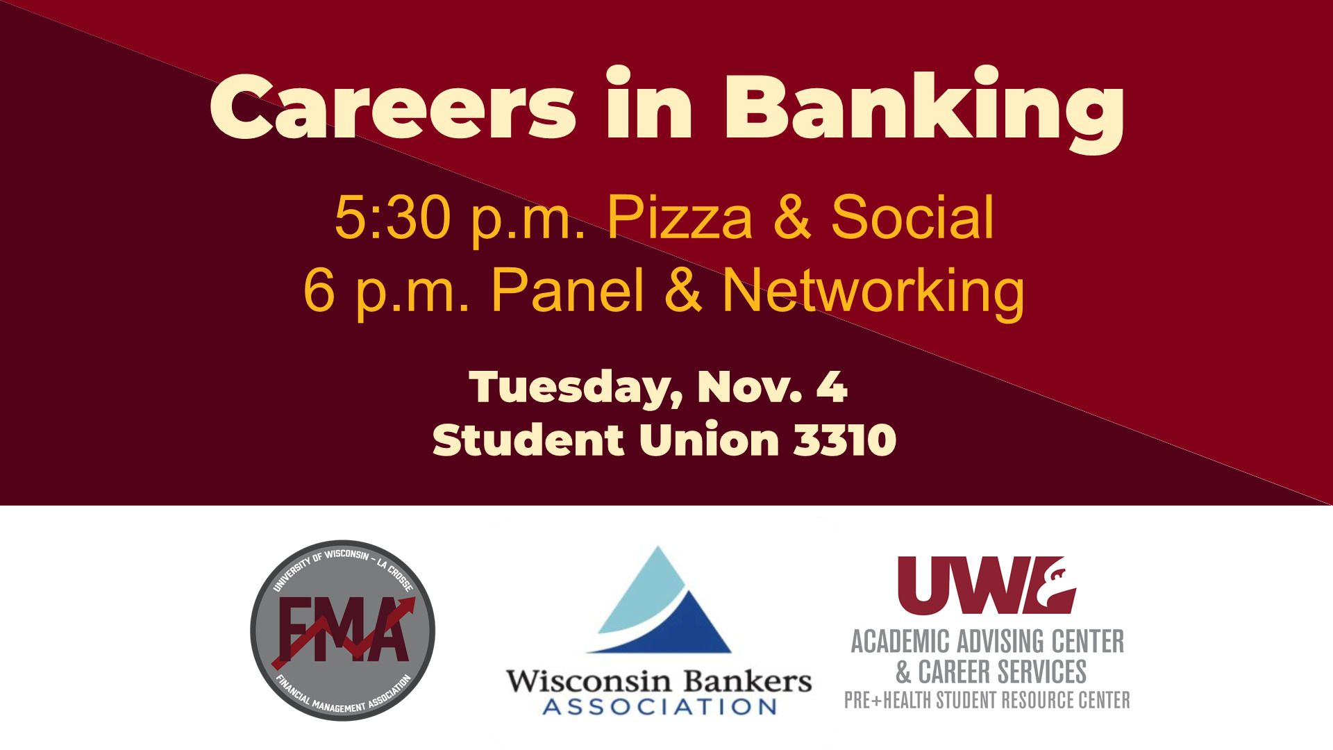 Are you interested in the Banking field? Then make sure you attend the Careers in Banking Panel. Tuesday, Nov. 4 at the Student Union 3310. You will be able to engage and network with Bankers who will provide different opportunities and experiences within Banking. There will be pizza and drinks provided at 5:30 p.m. and the Panel will start at 6 p.m.