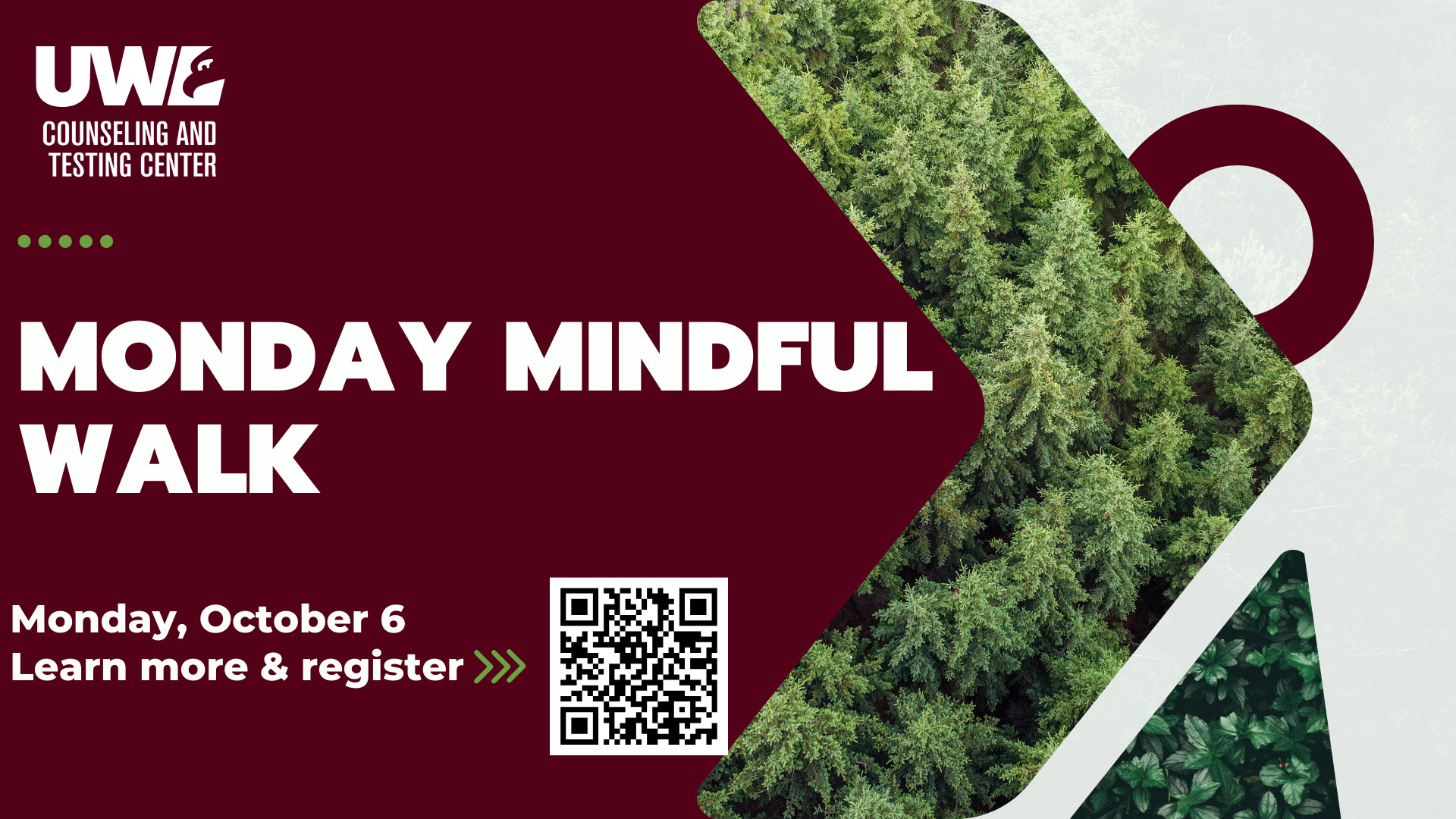 Join Counseling & Testing Center on Monday, October 6 at 3:30pm to support your wellness through mindful connection with nature.  Register for the activity by emailing ctc@uwlax.edu Please include in your email any accommodation needed to participate in the event.  Space is limited; we can accommodate up to 20 students.  Deadline to register for the event is Friday, October 3 at noon.
