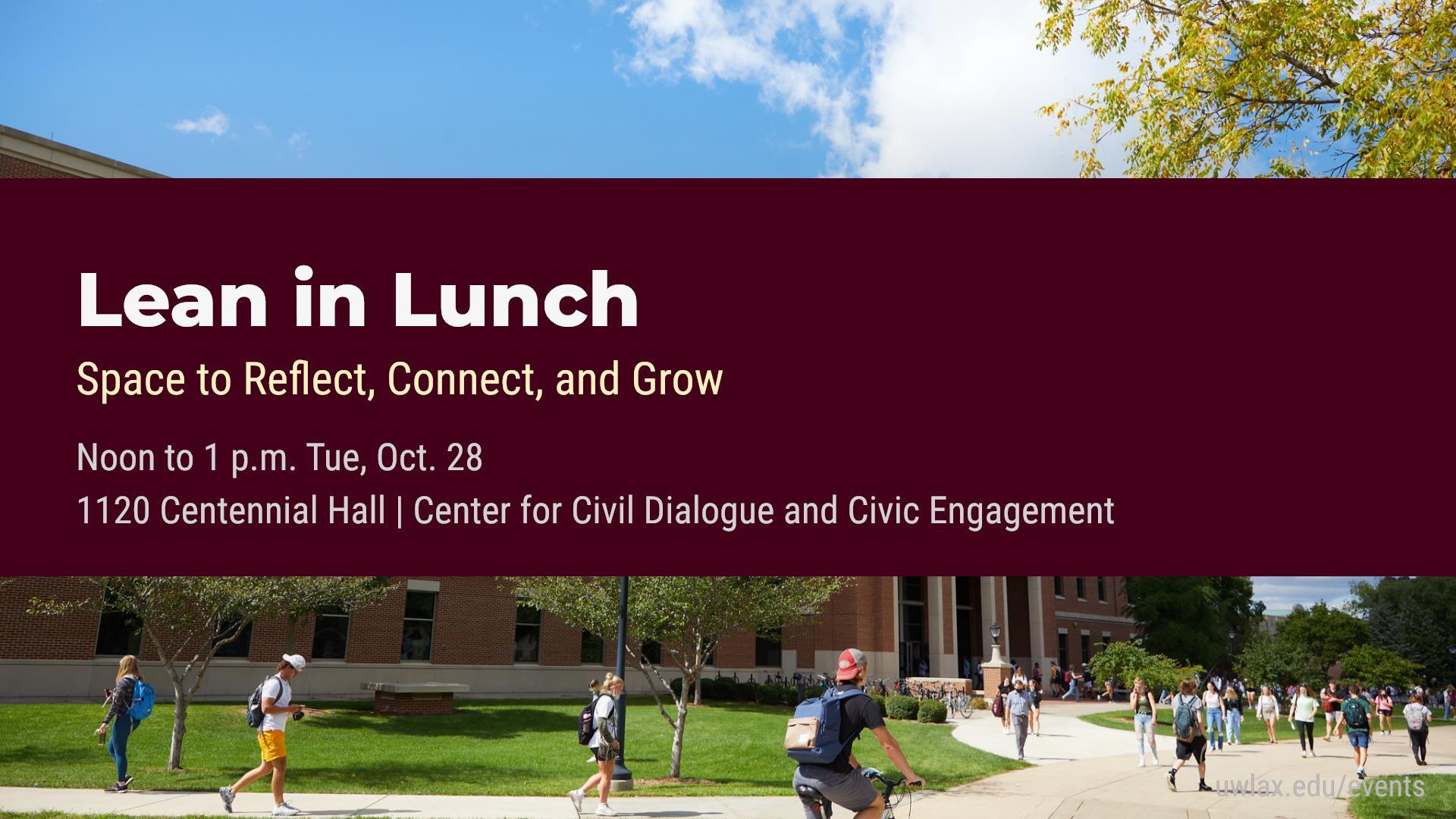 Lean In Lunches offer UWL students, staff, and faculty a welcoming space to explore cultural humility, deepen self-awareness, and engage with diverse perspectives. These informal gatherings invite participants to lean into what’s on their minds through open dialogue and shared reflection. Meet us at the Center for Civil Dialogue and Civic Engagement (CDCE). All are welcome!