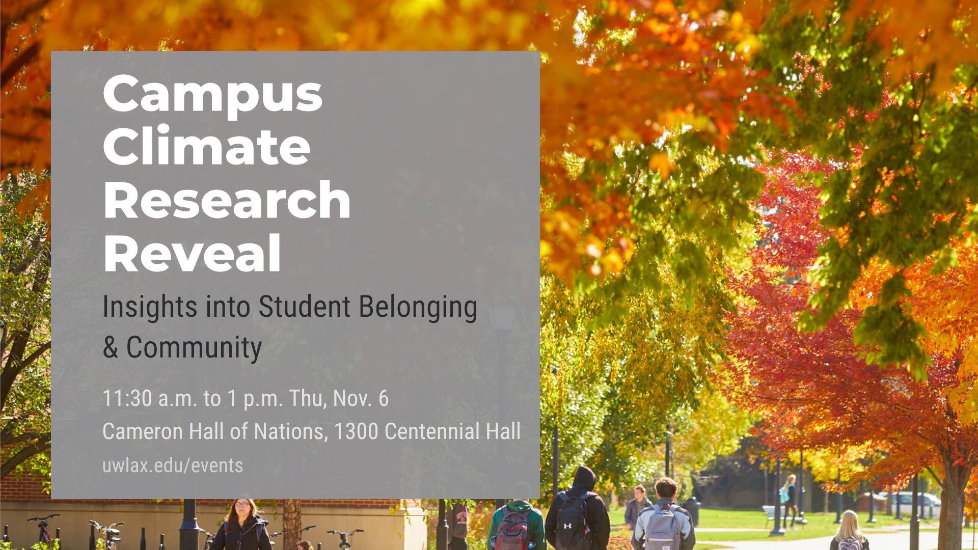 Join the Campus Climate Research Committee for a presentation and discussion! We will explore key findings from the Campus Belonging and Community Assessment Survey, conducted in Spring 2025. This event will specifically look at UWL student perspectives on: