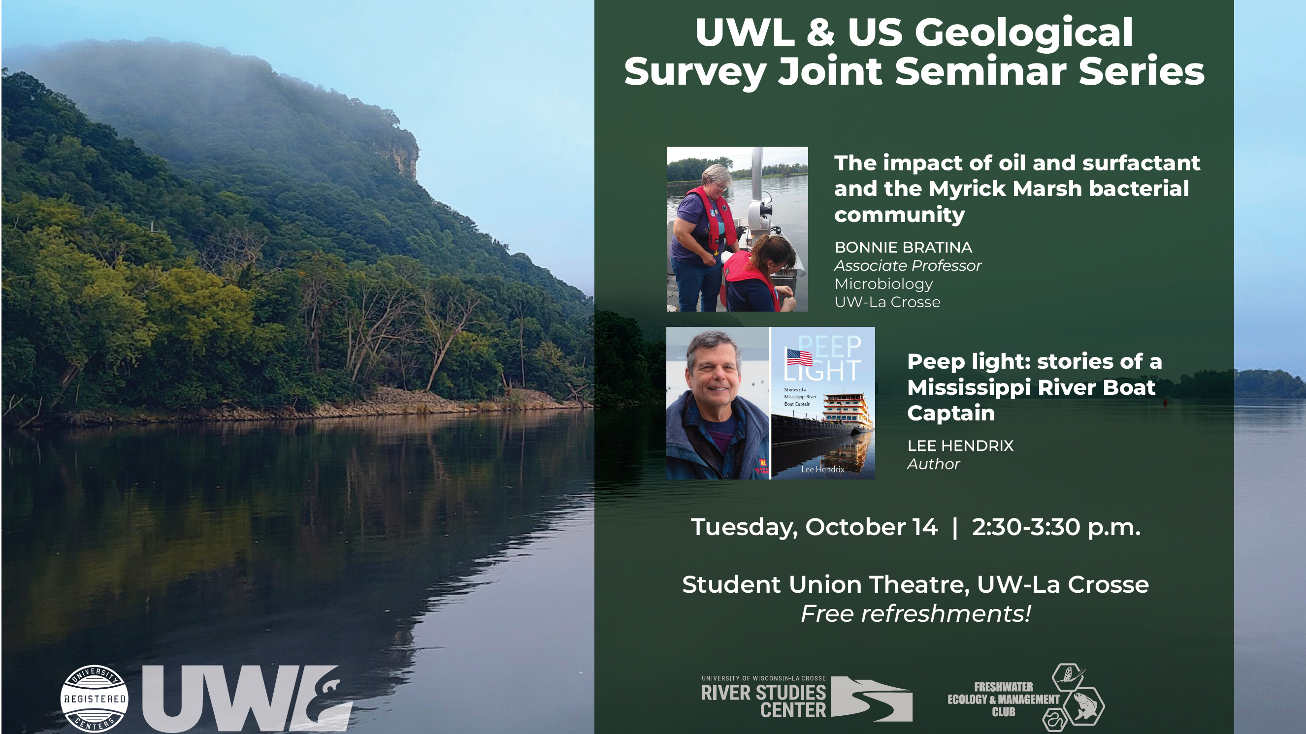 The UWL-USGS Joint River Seminar Series is back! We will be having our first seminar event on Tuesday, October 14 from 2:30-3:30 pm at the UWL Student Union Theatre. The UWL Freshwater Ecology and Management Club is organizing the monthly events and the River Studies Center is providing free refreshments (cookies, etc.).