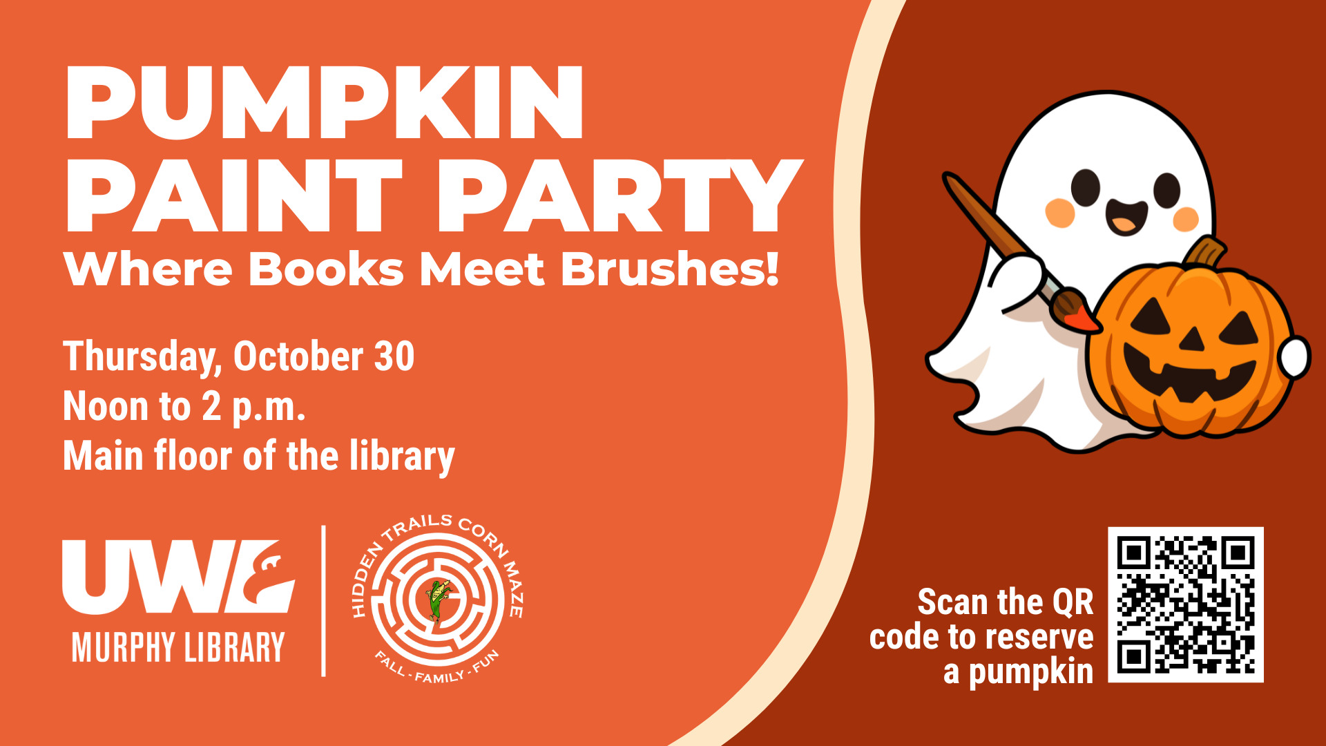 Murphy Library invites you to participate in a Halloween pumpkin painting party on Thursday, October 30, 2025, from 12 p.m. to 2 p.m.