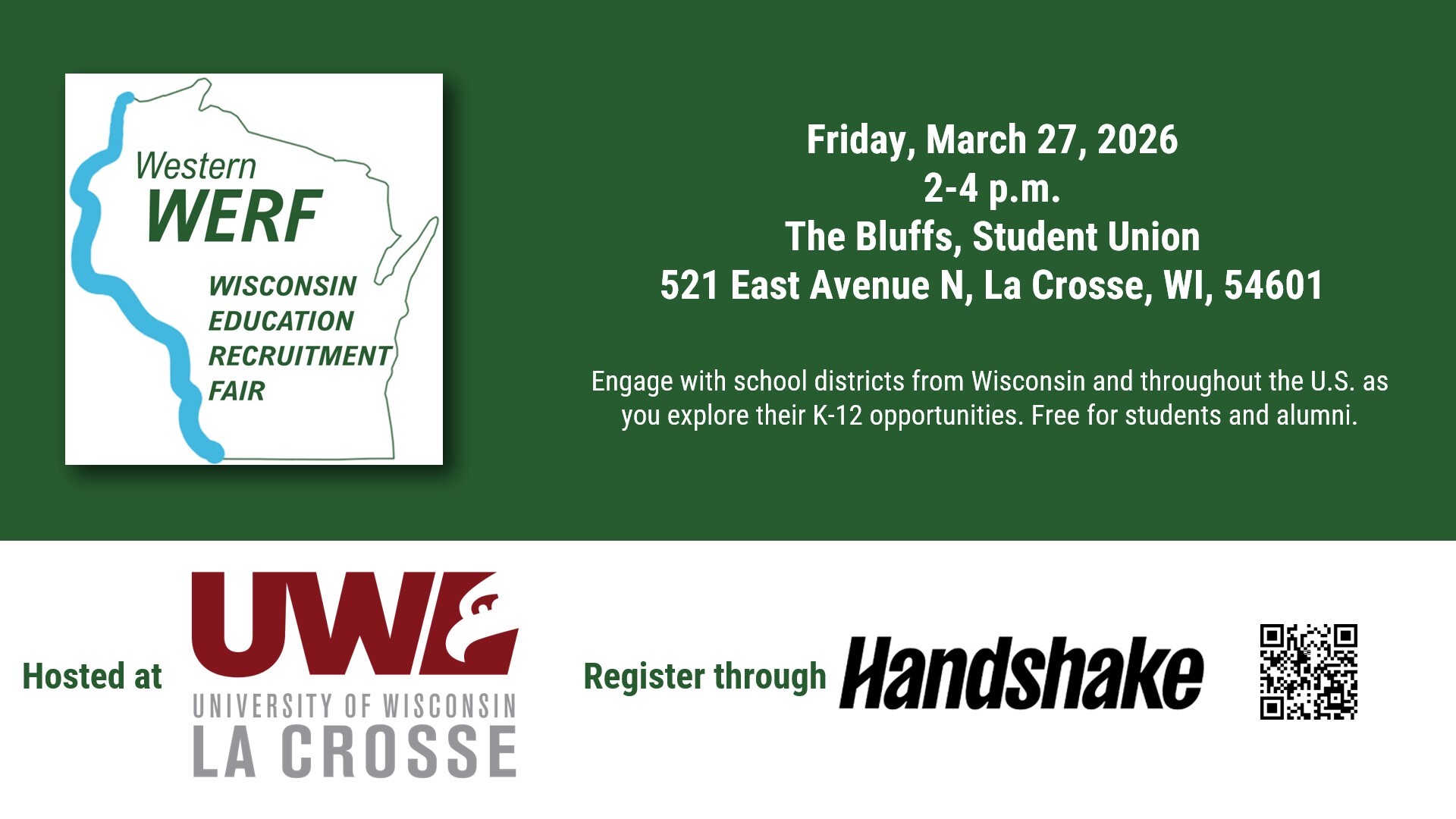 Western WERF is an educator fair held in Wisconsin early in the hiring season. Candidates interested in working in the K-12 school setting will have a chance to engage with school districts from Wisconsin and throughout the U.S. to explore their opportunities. The event is free for students, alumni, and community members. The fair is sponsored at UWL by the  Academic Advising Center & Career Services.