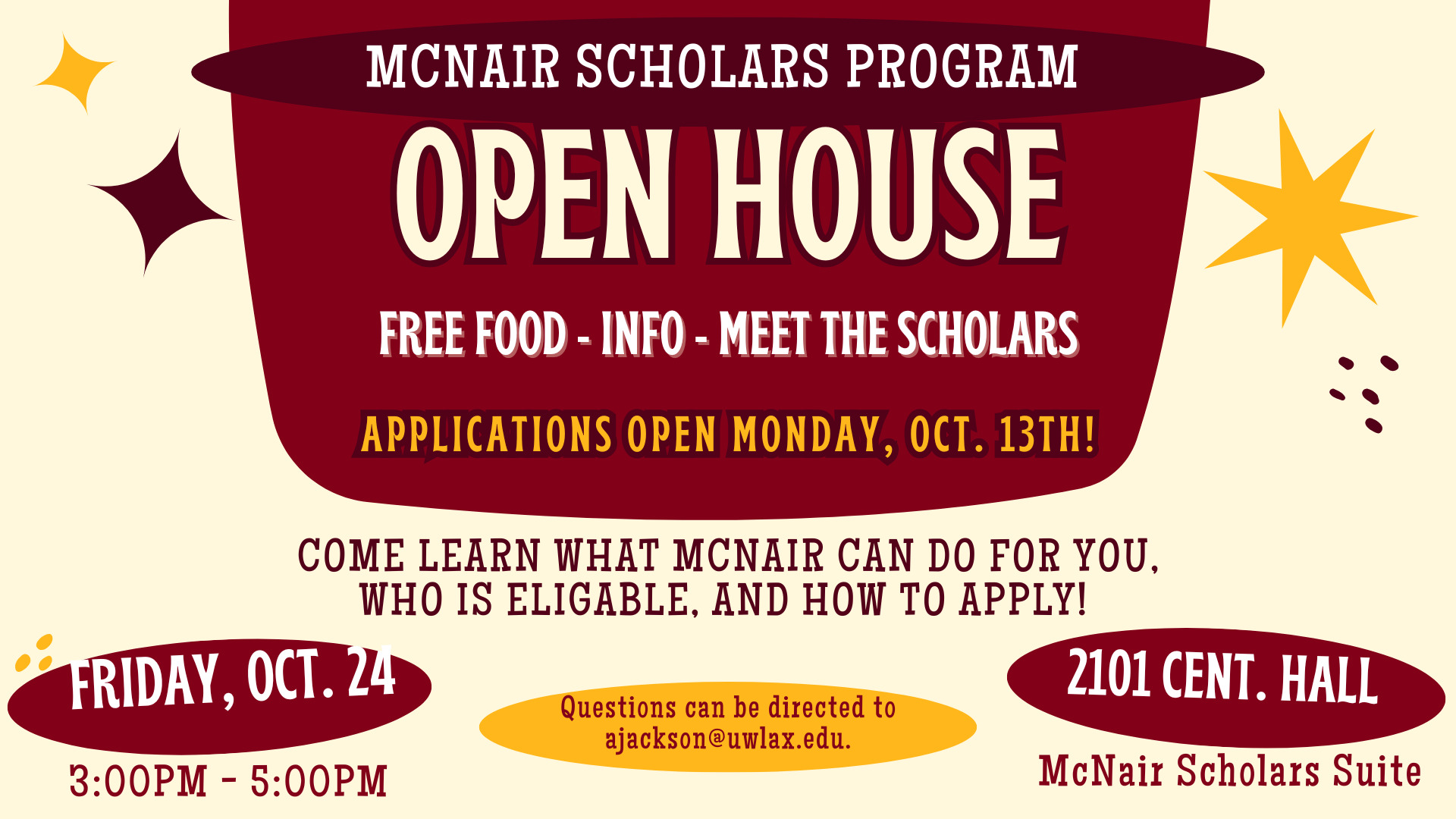 Join us to learn more about the McNair Scholars Program and how to apply to be a McNair scholar! Current scholars will be available to share their experiences in the program. View the current scholars' research posters in a gallery walk and enjoy our taco bar and mini-cupcakes.