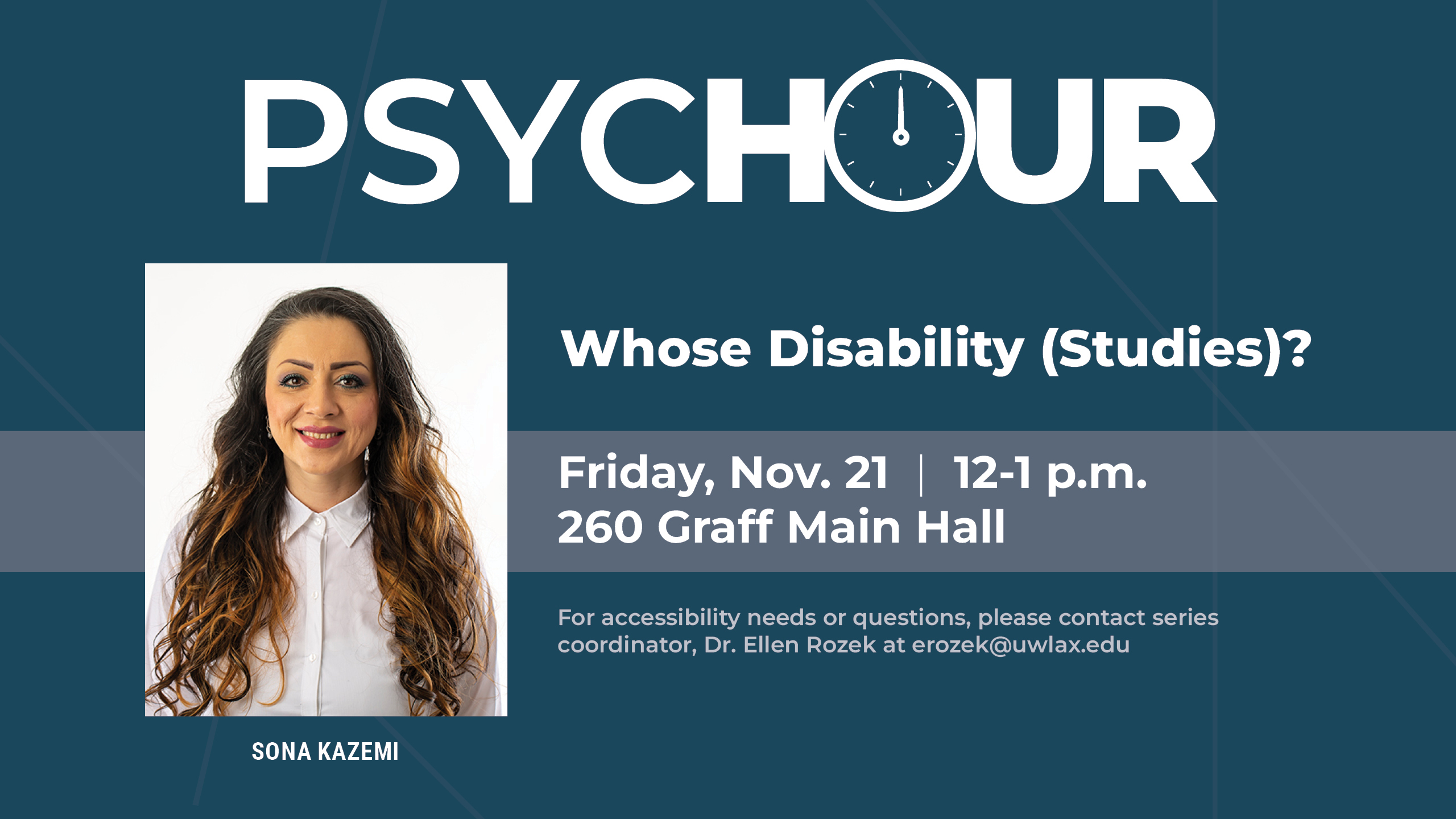 The Psychology Department invites you to our Psych Hour Series. This week's presentation is "Whose Disability (Studies)?" Dr. Sona Kazemi, recipent of a 2025 Eagle Teaching Excellence Award and educator in the Department of Race, Gender, and Sexuality Studies, is joining us to talk about her current scholarship and forthcoming book (Disabling Relations: Wounded Bodyminds & Active Witnessing).