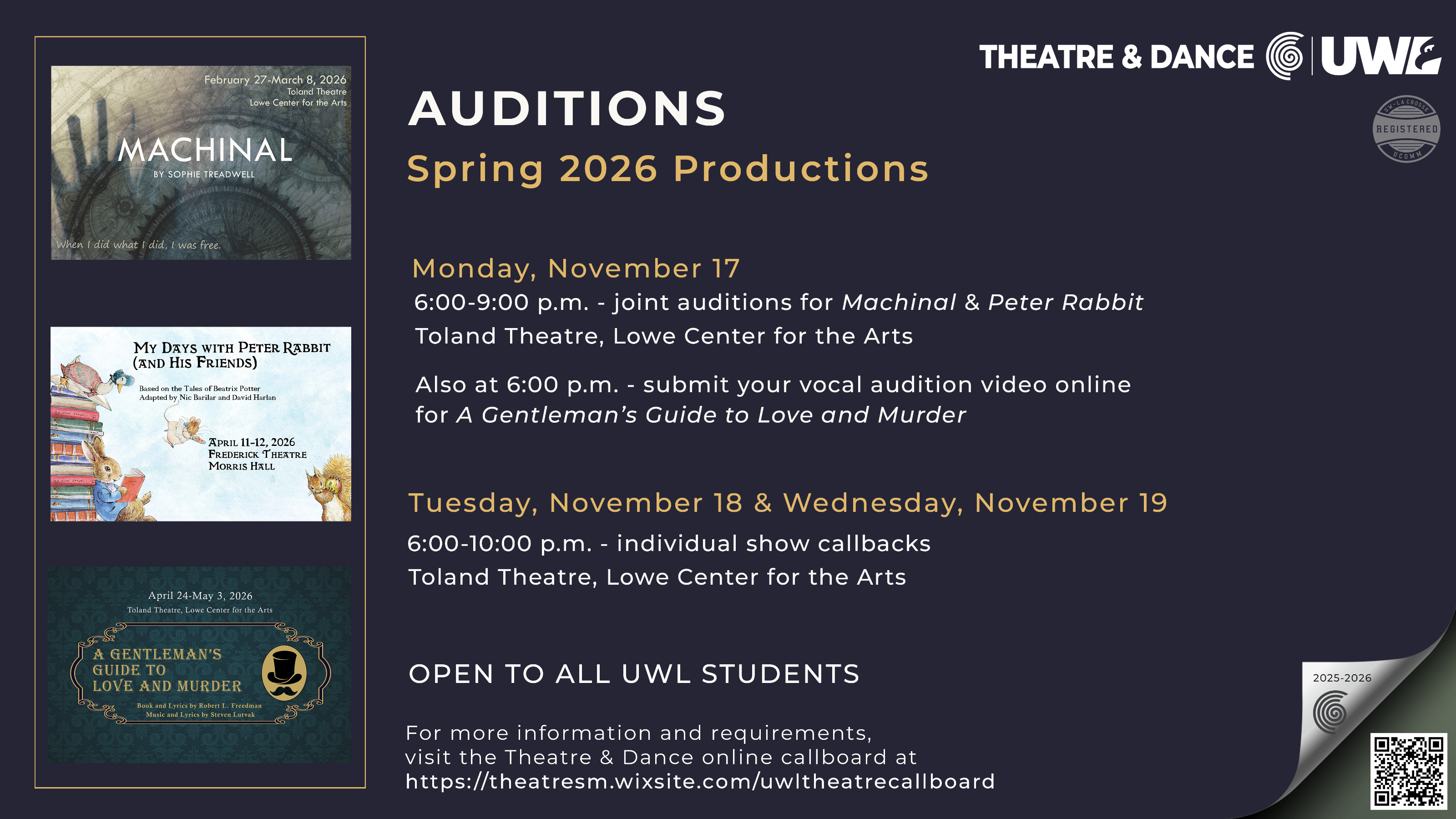 The UWL Department of Theatre and Dance will be holding open auditions for their spring productions including Machinal, My Days with Peter Rabbit (And His Friends), and A Gentleman's Guide to Love and Murder (musical).  Auditions are open to ALL UWL students.