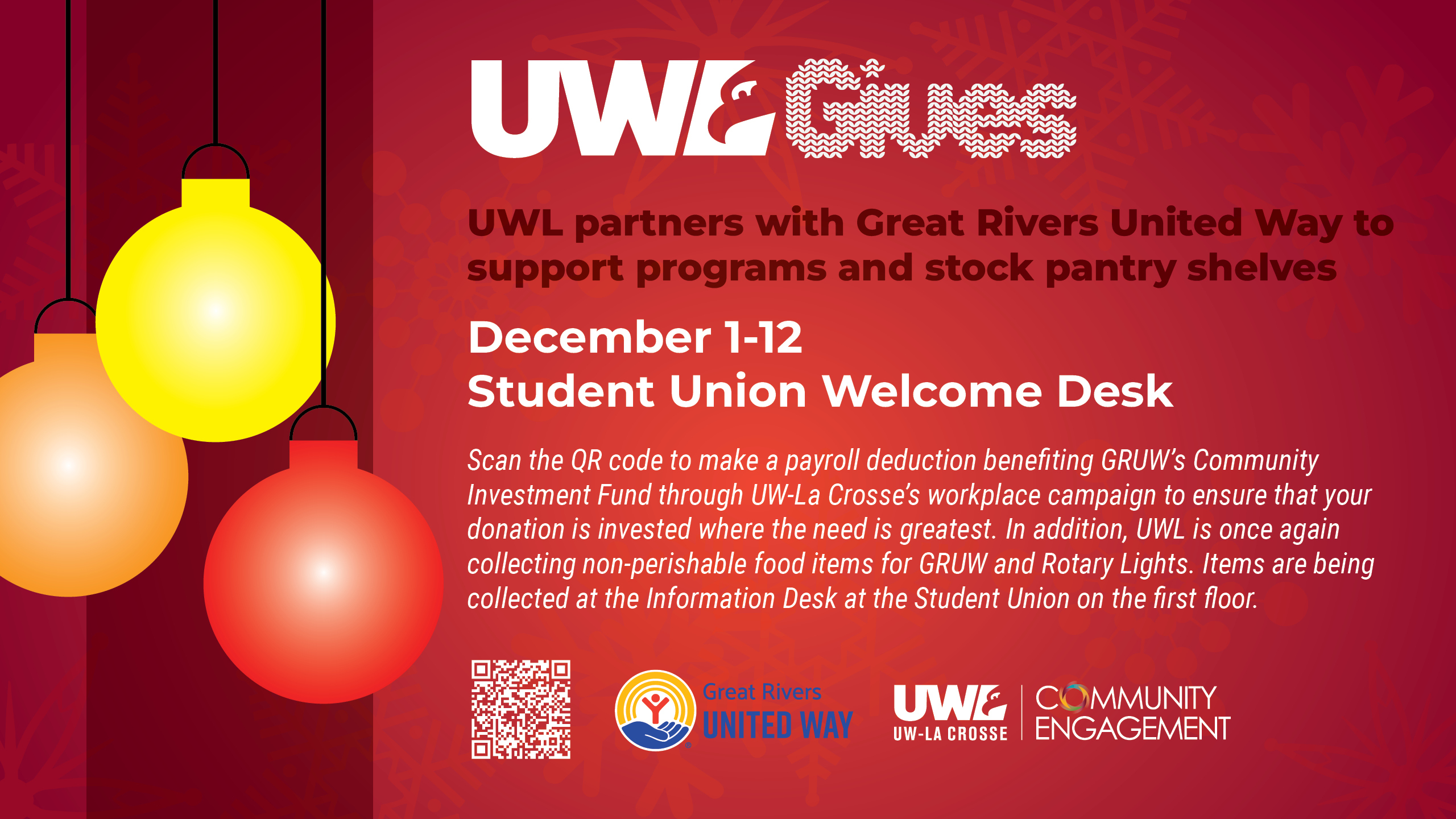 From December 1-12, UWL is hosting an employee workplace campaign to benefit the GRUW grants program, as well as a food drive for the GRUW and Rotary Lights annual non-perishable food collection, which helps benefit UWL’s Food Pantry.