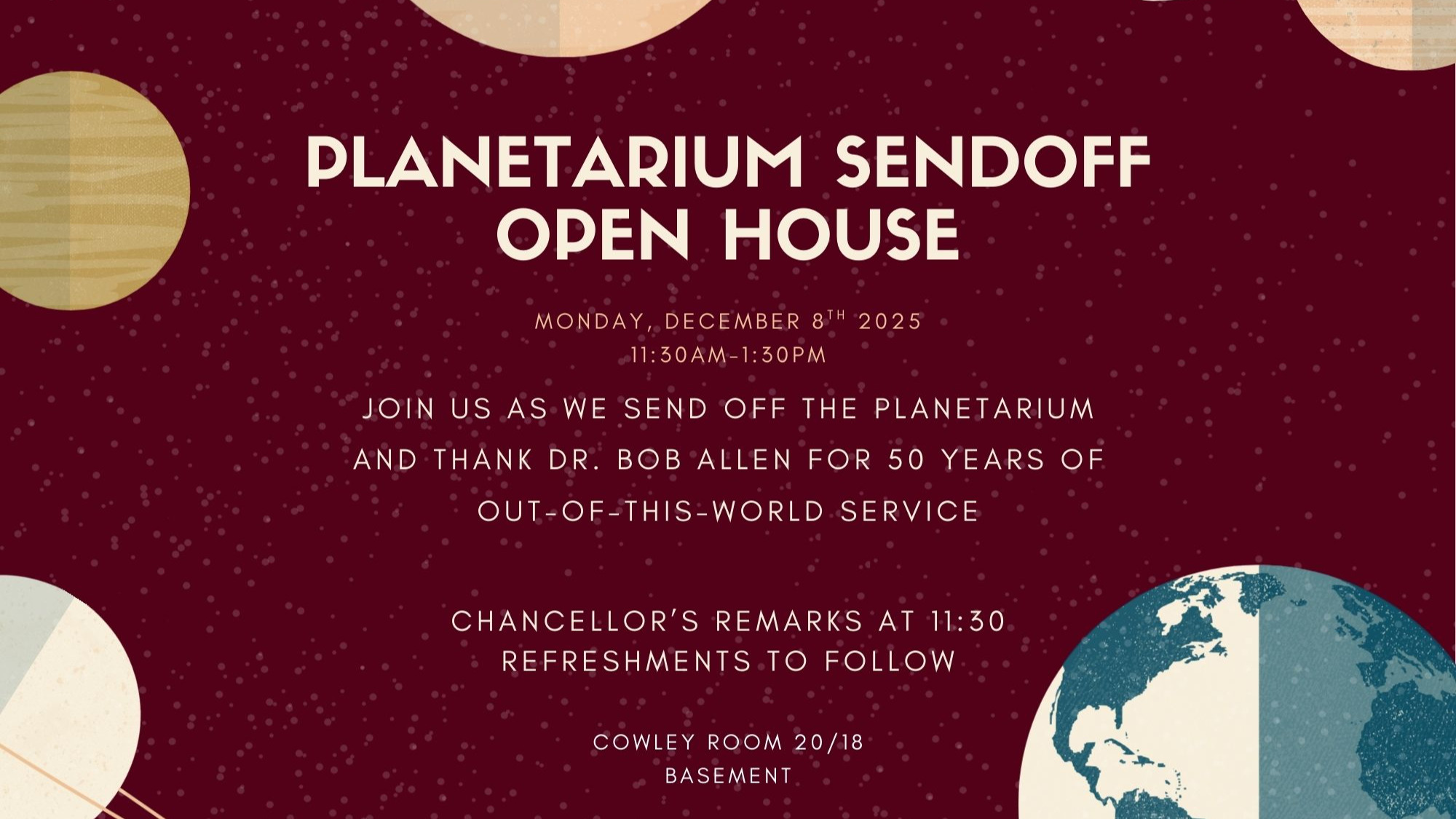 Join us as we send off the planetarium and thank Dr. Bob Allen for 50 years of out-of-this-world service to UWL. This event is open to campus. The Chancellor will give remarks at 11:30am with refreshments and a small reception to follow.